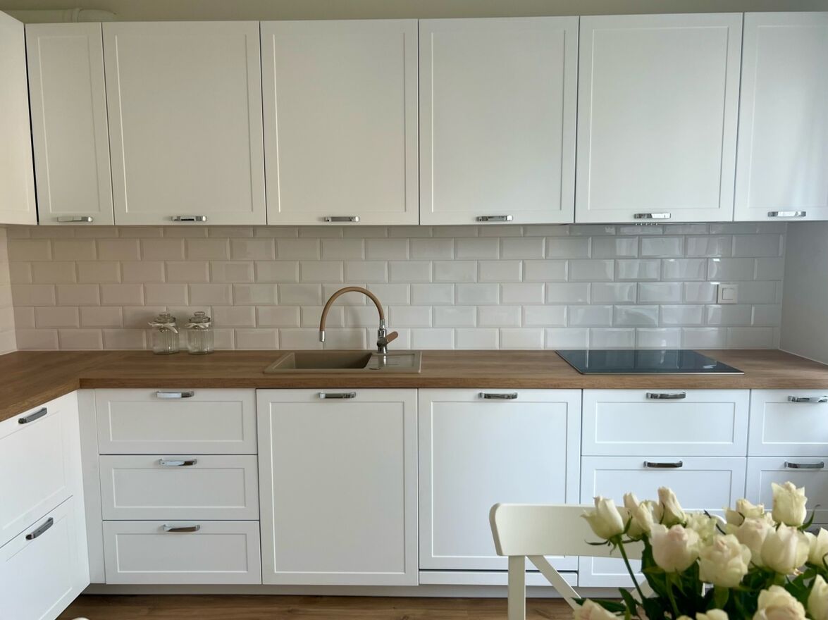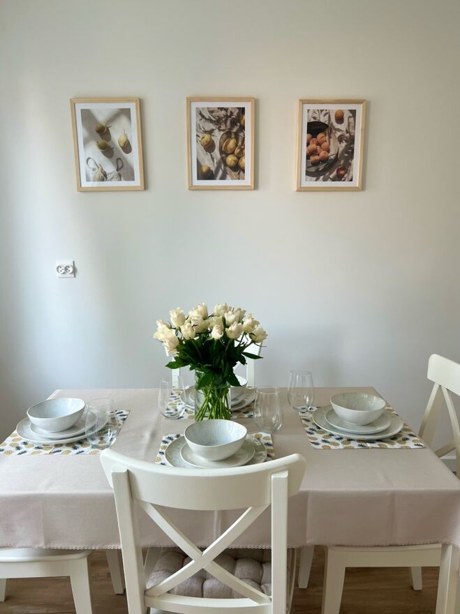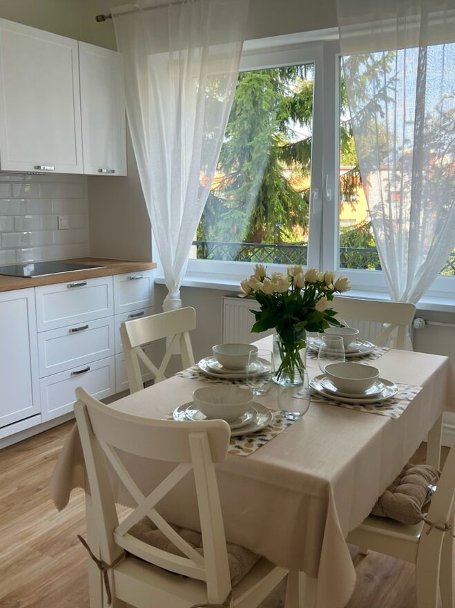 Kuchnia (~12m2): przestronna i nowoczesna kuchnia, w pełni wyposażona - nowy sprzęt AGD (lodówka, zmywarka, piekarnik, kuchenka) wraz z jadalnią (stół, 4 krzesła)