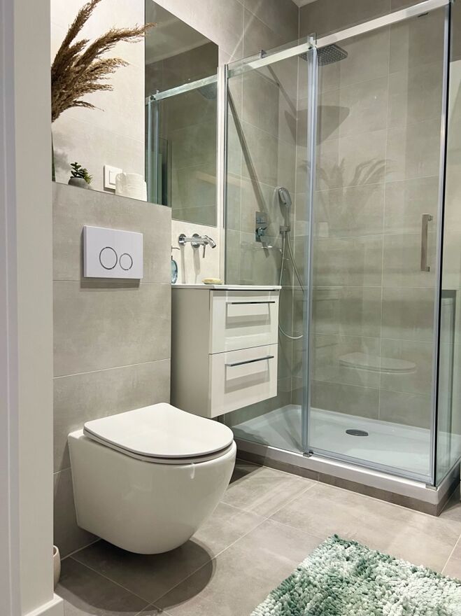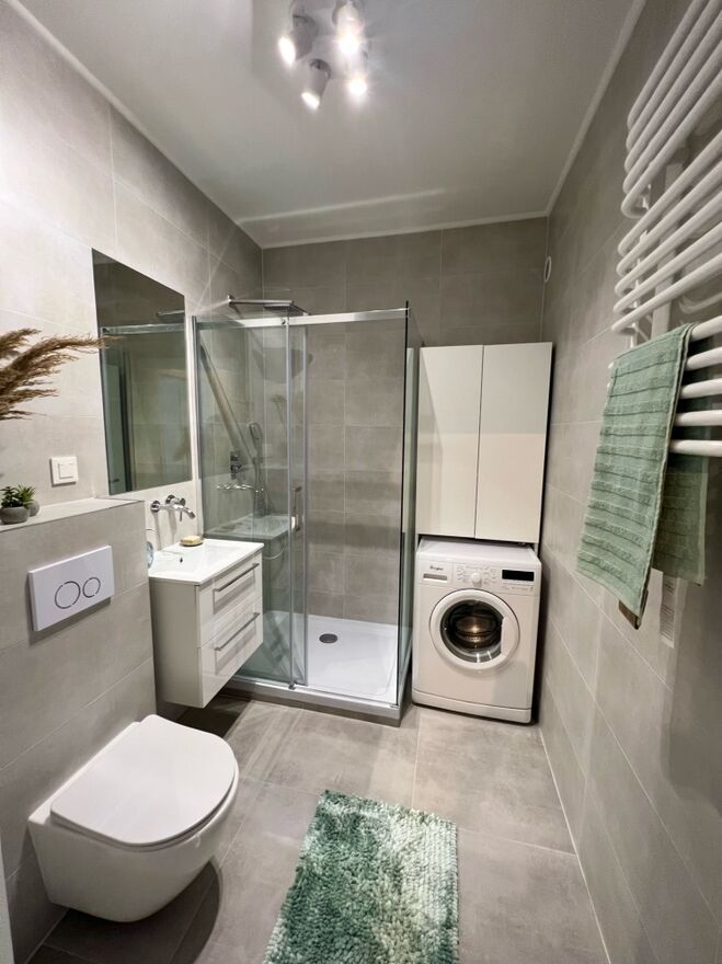 Bathroom (4m2): shower, toilet, washbasin with cabinet, washing machine, mirror, cabinet