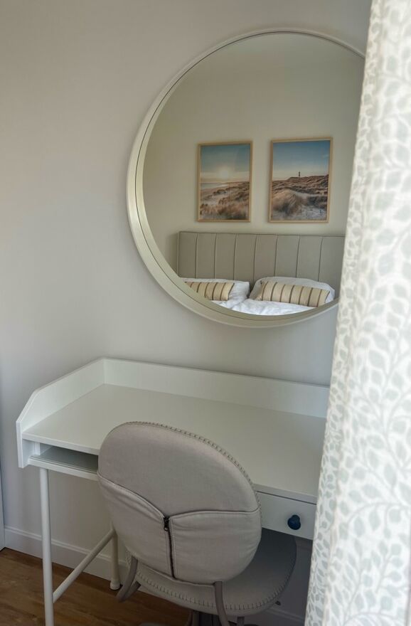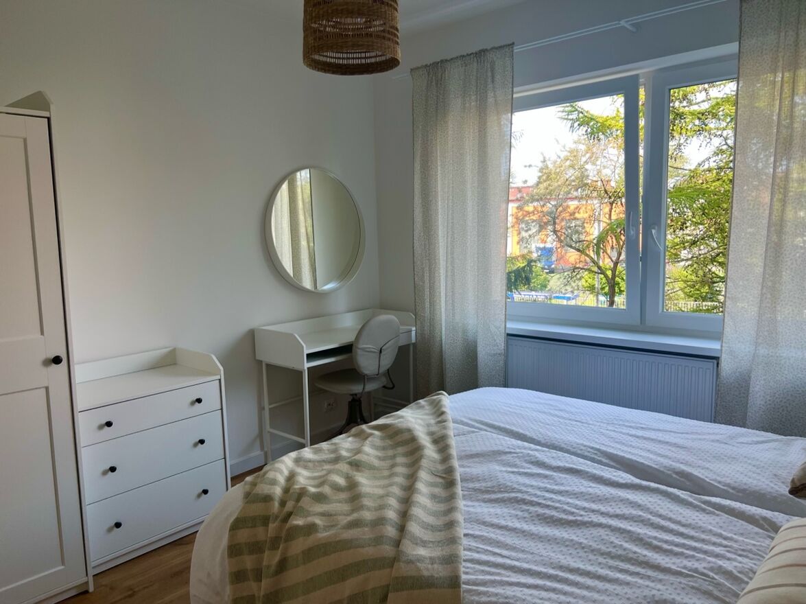 Sypialnia (~12m2): przytulna sypialnia, podwójne łóżko kontynentalne (możliwość rozłączenia na dwa osobne łóżka), szafa, komoda, toaletka/biurko z krzesłem, lustro, stoliki nocne