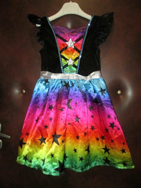 Śliczny strój dla dziewczynki. Na metce rozmiar 98-104 cm. Sukienka ma przeźroczyste rękawy, na tułowiu kolorowe ...