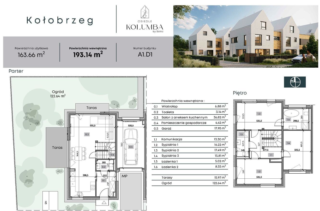 A1 o pow. 163,66 m2 z garażem o pow. 17,95 m2 i ogródkiem o pow. 122,64 m2