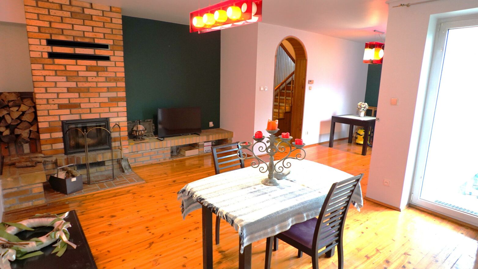 Salon z kominkiem i jadalnią z wyjściem do ogrodu,