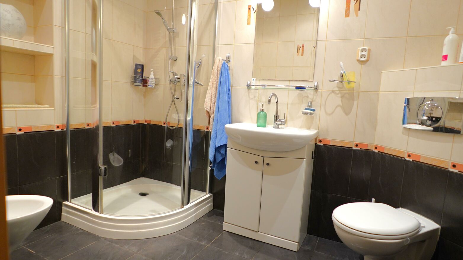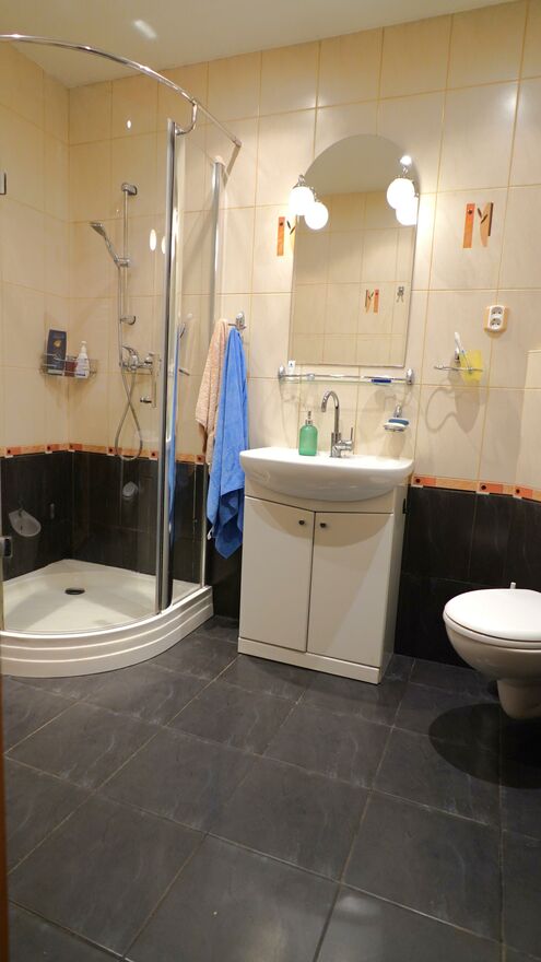 Łazienka z WC , z kabiną prysznicową , misa ustępowa wisząca , bidet , umywalka