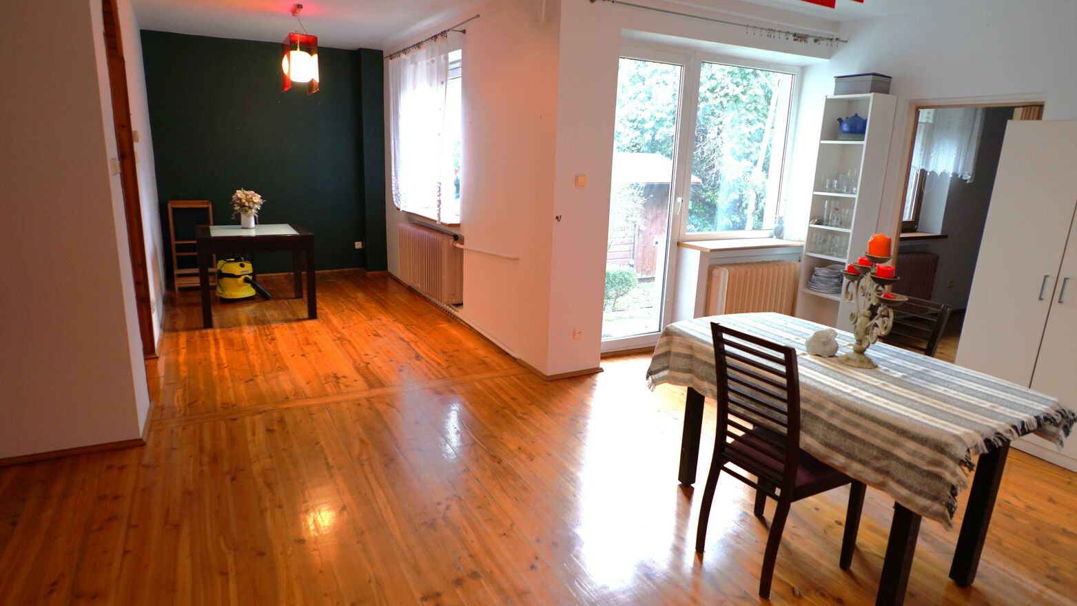 Nieruchomość stanowi budynek narożny w zabudowie szeregowej, połączony z jednym sąsiednim budynkiem garażem, co zapewnia większą prywatność.
