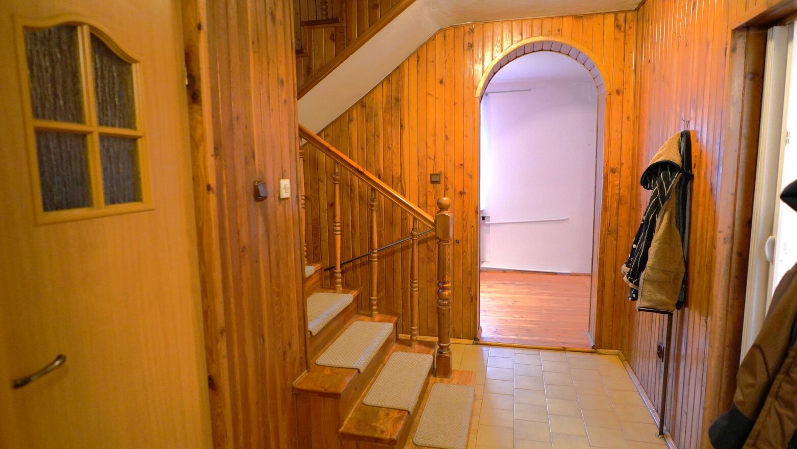 klatka schodowa w przedpokoju z oknem na półpiętrze schody drewniane