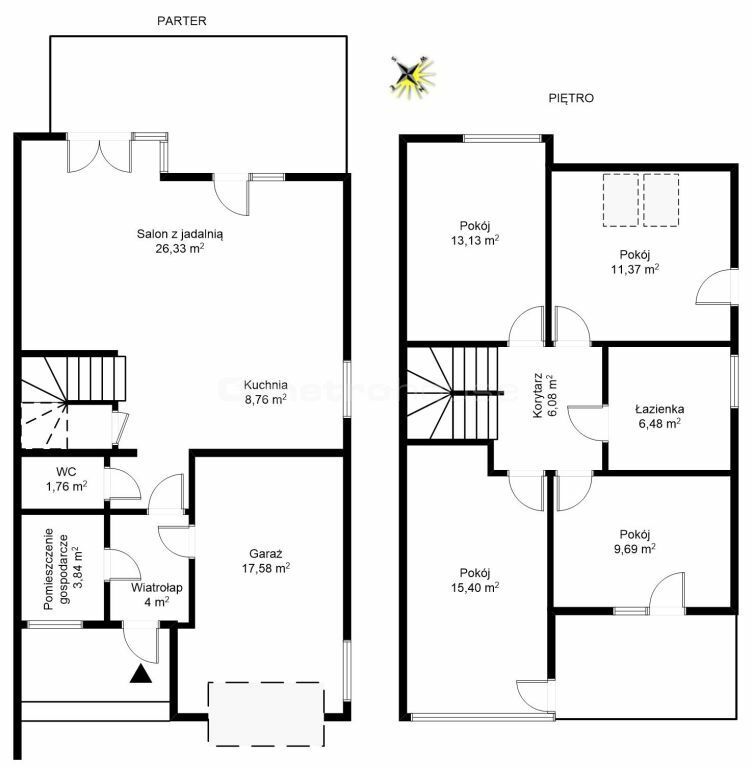 Parter domu to otwarty przestrzennie salon z aneksem kuchennym, który stanowi serce domu i miejsce spotkań dla całej rodziny. Dodatkowo na parterze znajduje się funkcjonalny schowek, kotłownia oraz garaż na samochód, co zwiększa komfort użytkowania. Piętro oferuje cztery przytulne sypialnie oraz przestronną łazienkę.