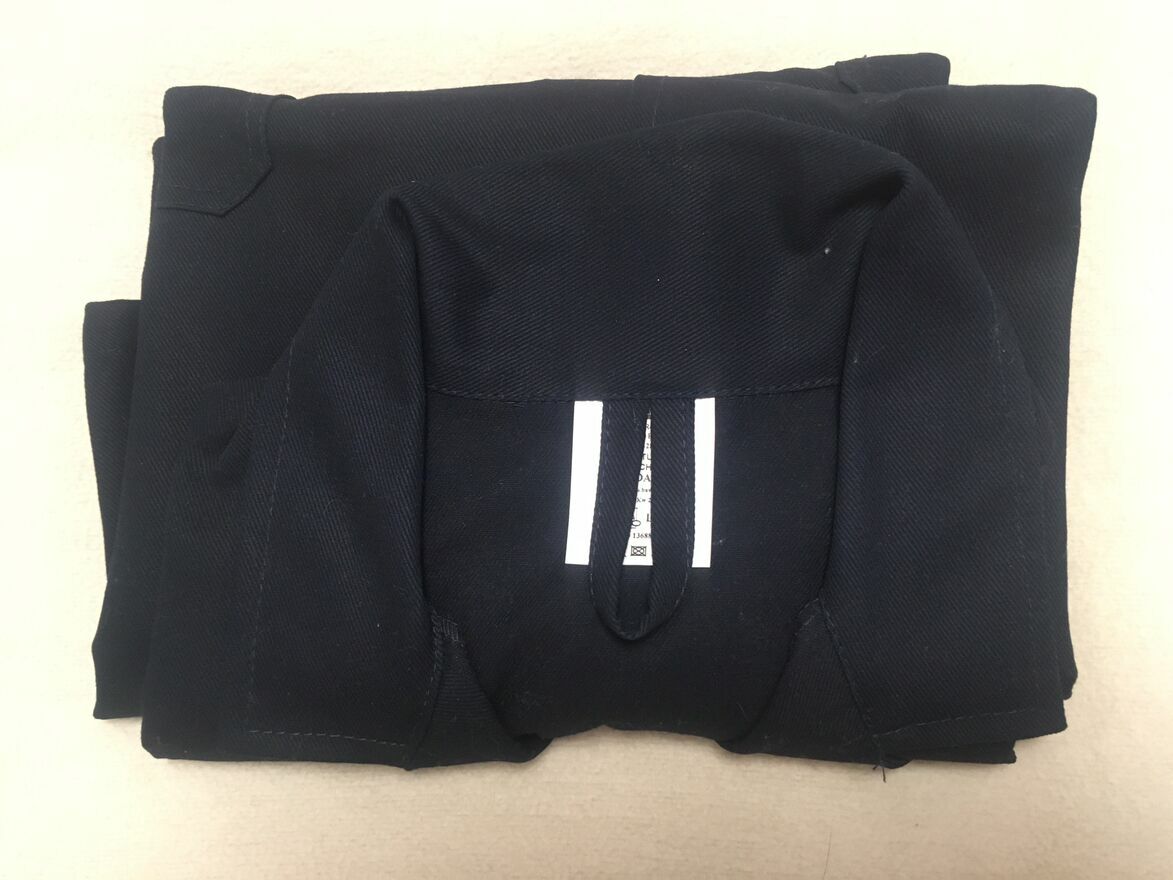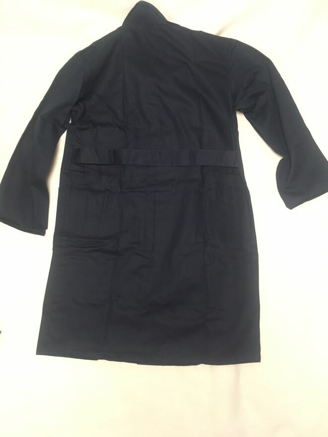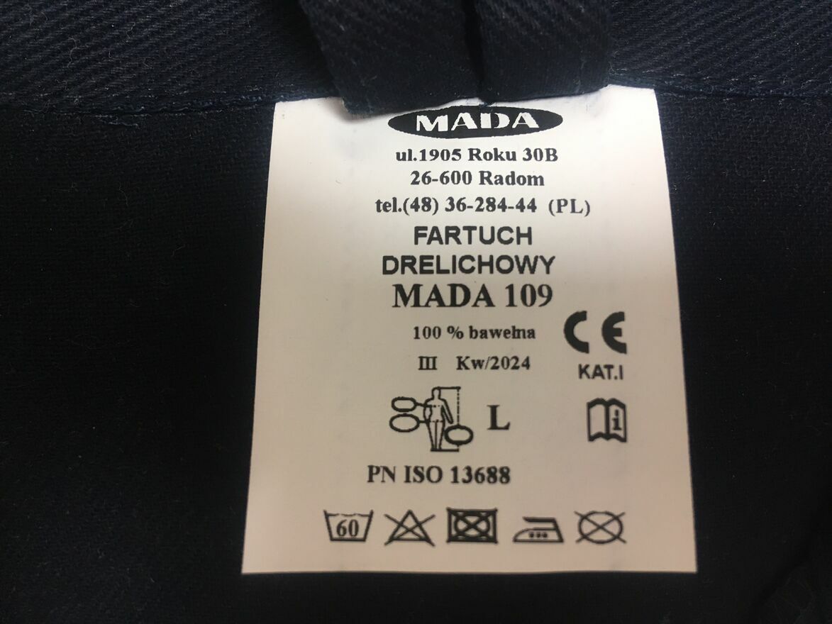 Dzień dobry Państwu.Oferuję do sprzedaży fartuch roboczy drelichowy. Rozmiar L. Choć podane wymiary mogą zainteresować osoby noszące rozmiar M. Producentem jest polska firma z Radomia Mada. Nie pachnie brzydko, jak niektóre dalekowschodnie modele. Wykonany z solidnego materiału, bawełniany (metka). Kolor czarny / granat / inny ciemny. Można prać aż w 60 stopniach, likwidując zabrudzenia. Z przodu kieszenie.