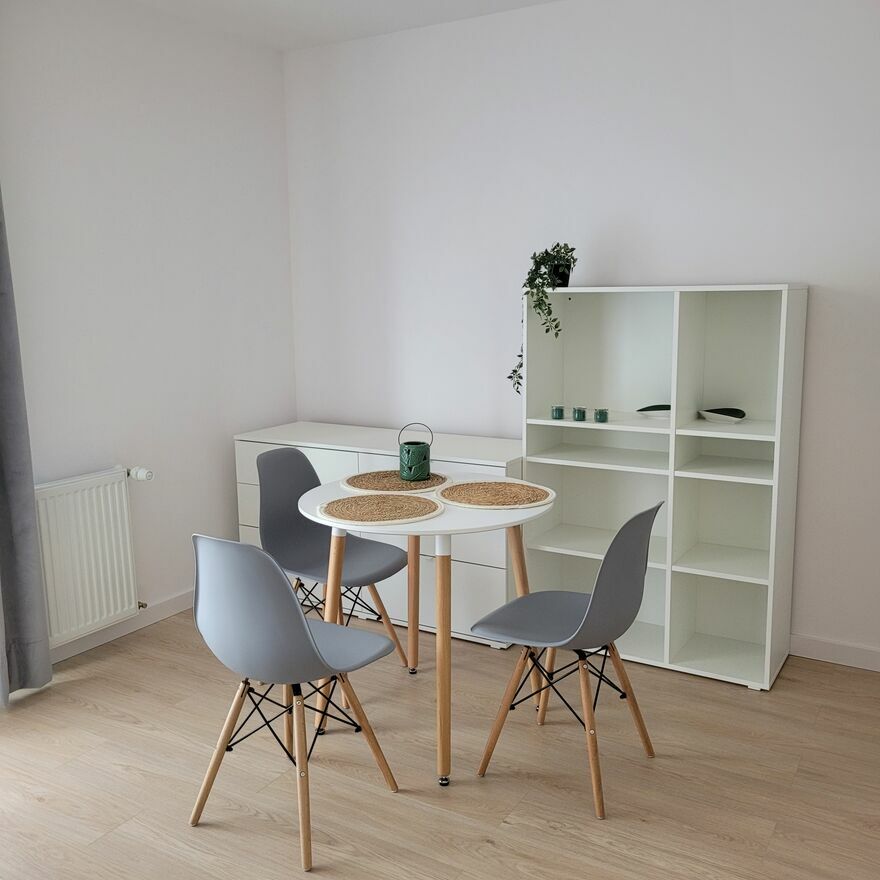Składa się z salonu z aneksem kuchennym, małego pokoju, łazienki z kabiną prysznicową, dużego wygodnego balkonu z widokiem na Parsętę.