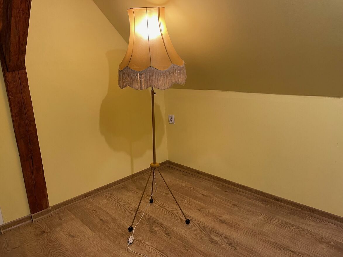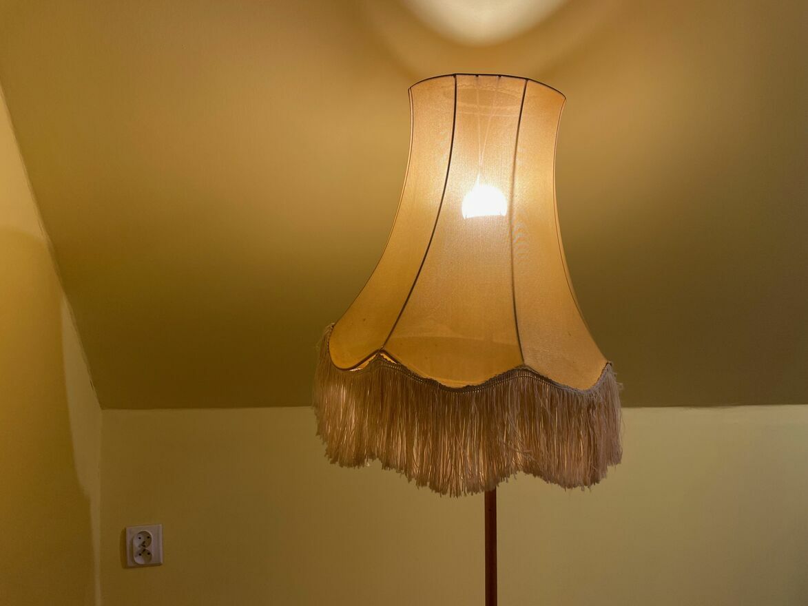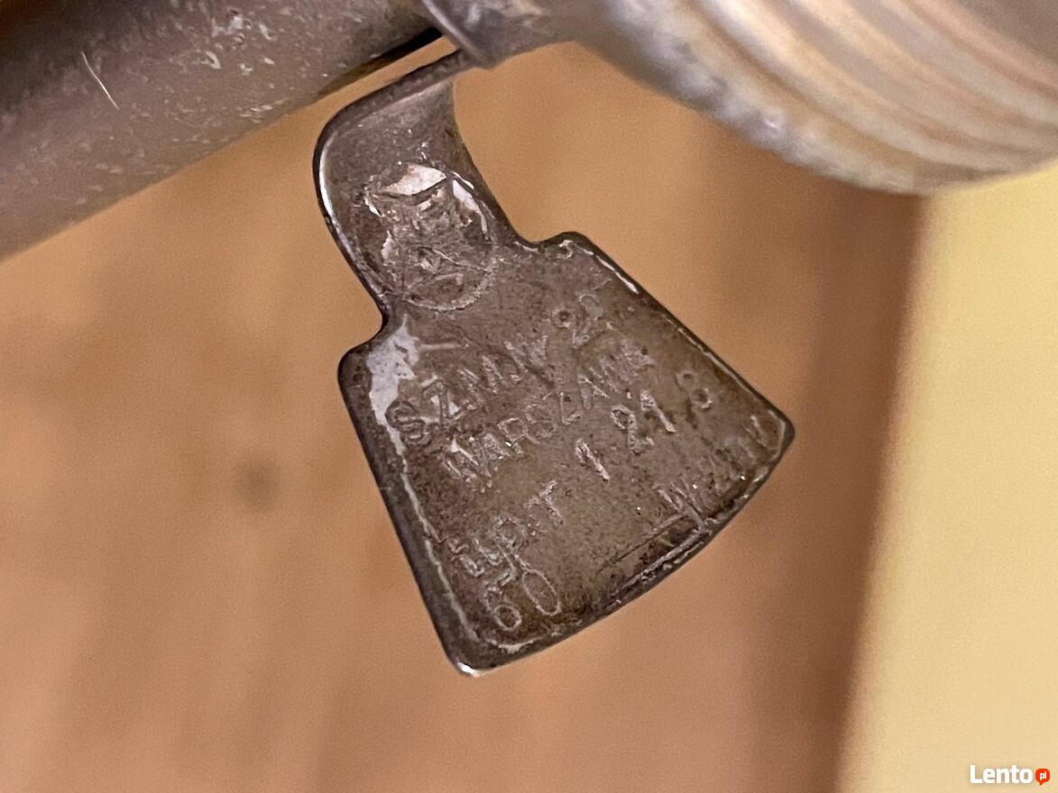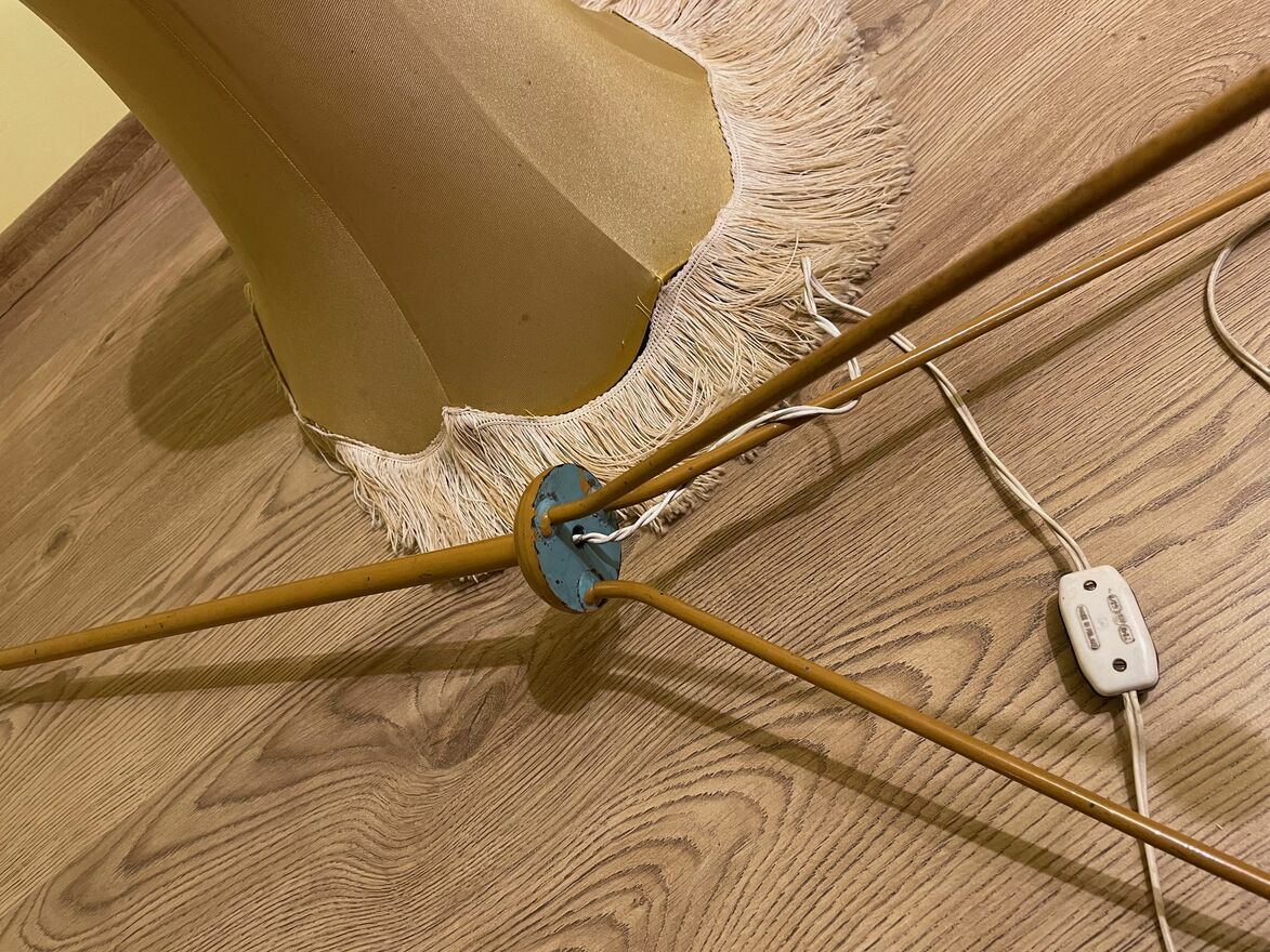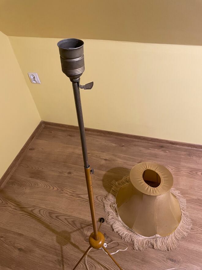Dzień dobry Państwu.Oferuję do sprzedaży starą lampę metalową stojącą z czasów PRL. Zasilanie 230V, na typową oprawę E27 gdzie można wkręcić tradycyjną lub żarówkę LED o takim gwincie. Kolor odcienie brązu, natomiast klosz odcienie żółci. Pochodzi z przełomu lat 60 i 70-tych ubiegłego wieku. Produkcji Stołecznych Zakładów Metalowych nr 2 przez zatrudnionego tam wówczas znanego polskiego projektanta prof. Apolinarego Gałeckiego. Na 4 zdjęciu widać metalową cechę produkcyjną lampy. To ikona polskiego designu. Na uwagę zasługuje prostota projektu, gdzie regulacja wysokości jest za pomocą gwintowanej radełkowanej specjalnej nakrętki. Lampa jest cała w oryginale, wraz włącznikiem, wtyczką i wszystkim czarnym kulkami w stopkach oraz przewodem elektrycznymi i oprawką żarówki. To dziś rzadkość. Klosz prosty z mocowaniem drucianym nakładanym na żarówkę. Lekkiej poprawy wymaga jedynie obszycie frędzli, gdzie poluzowała się nitka oraz materiał klosza do odkurzenia / wyprania wedle uznania. Stąd tak atrakcyjna cena.