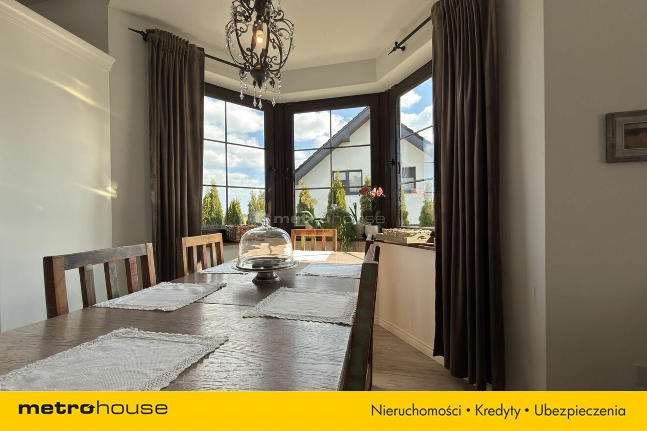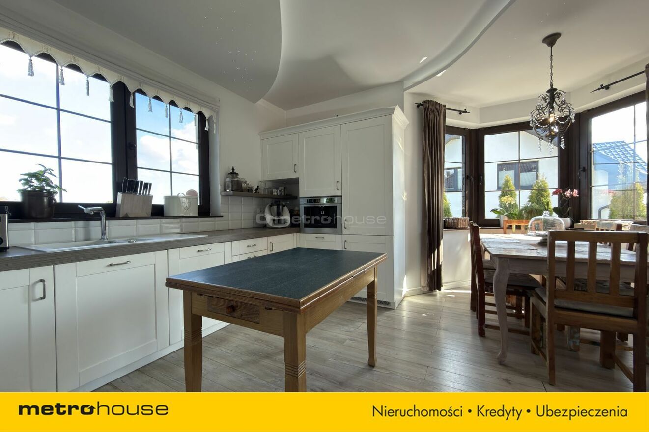 Kuchnia w zabudowie z częścią jadalnianą tworzy spójną i funkcjonalną przestrzeń. Duże okna oraz wysokiej jakości materiały wykończeniowe podkreślają charakter nieruchomości.