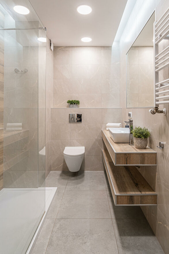 -łazienka wyposażona w duży prysznic, zlew, wc,
