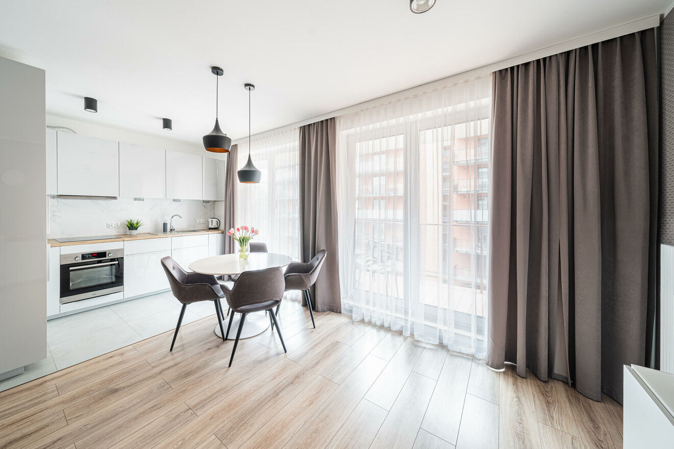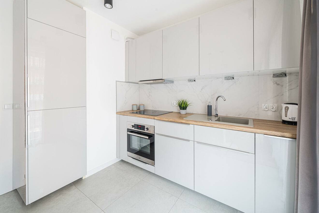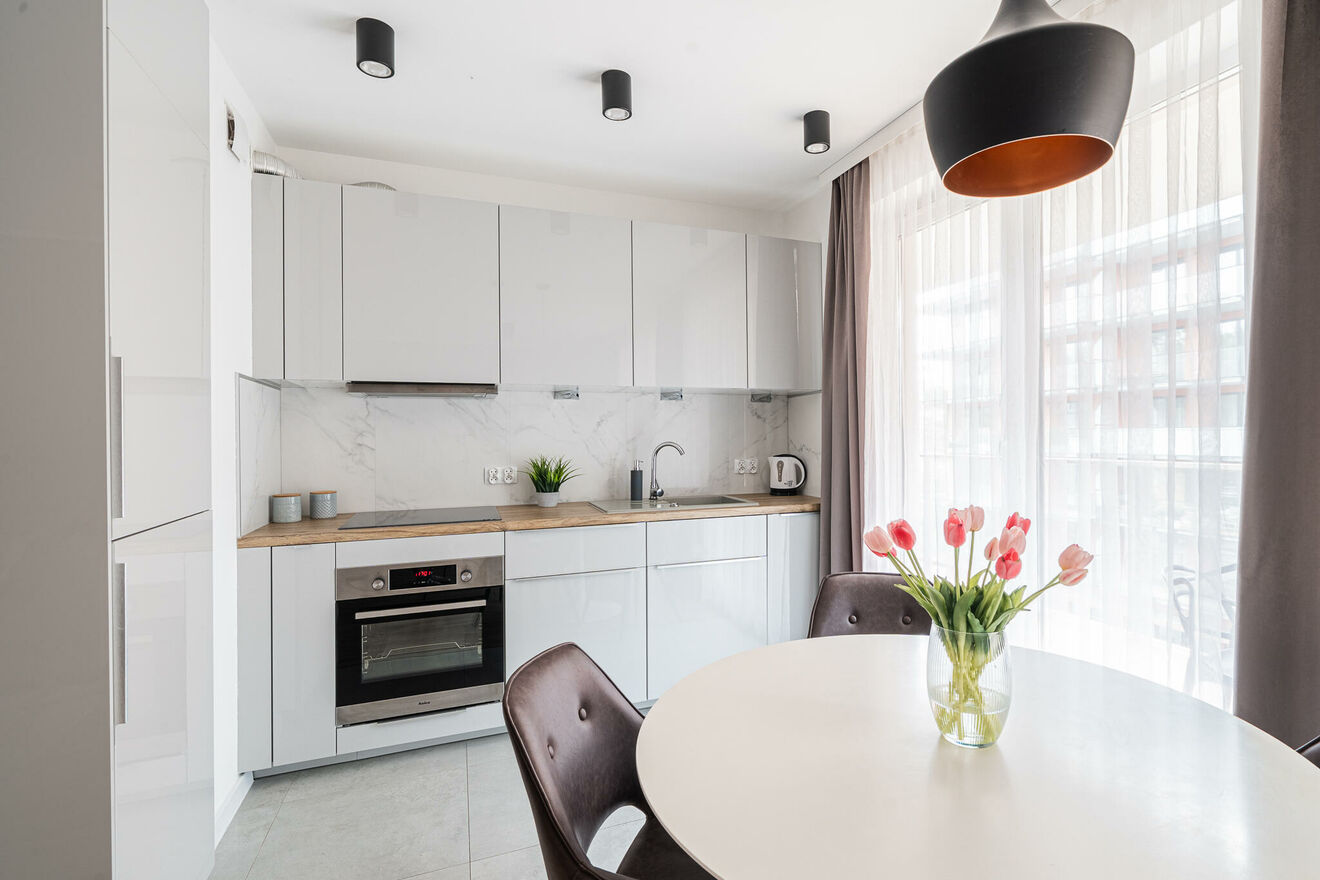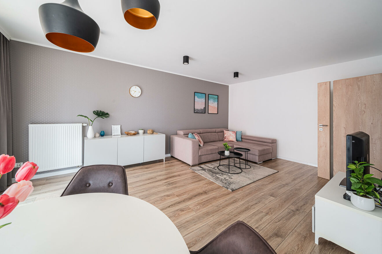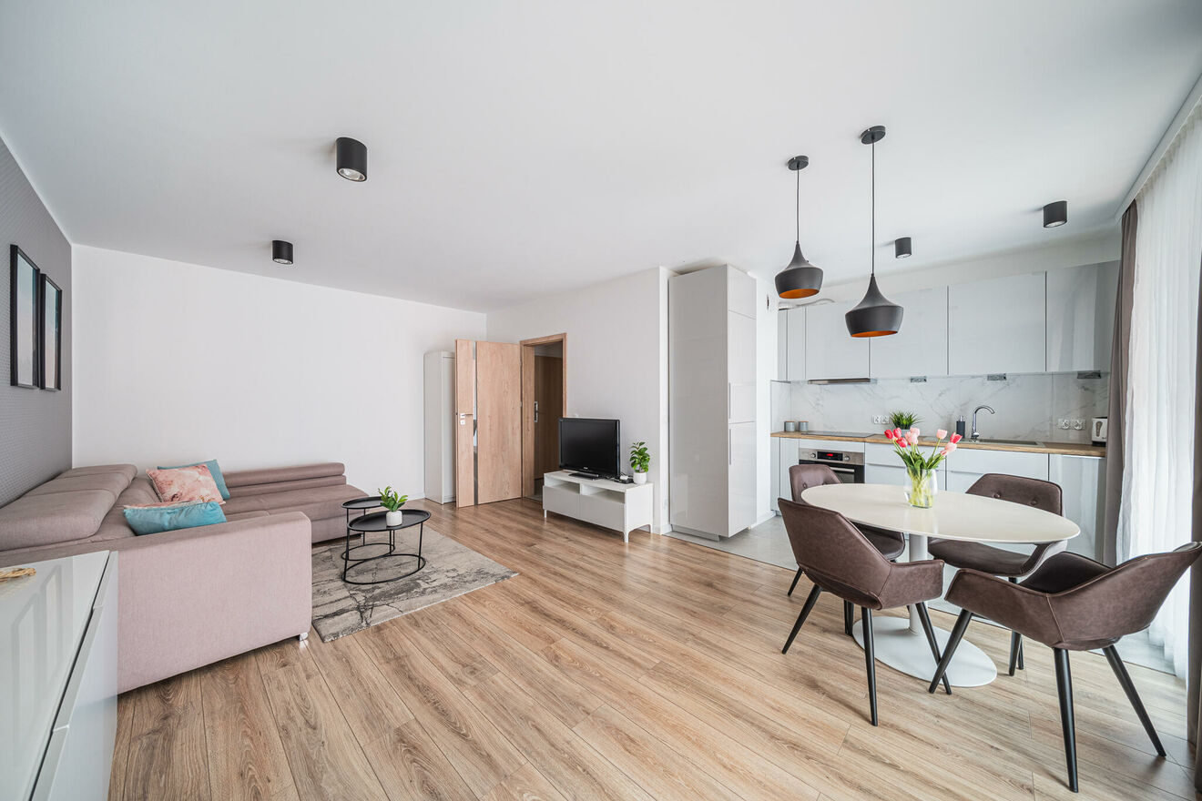 -pokoju dziennego z aneksem kuchennym. Kuchnia w pełni wyposażona: zmywarka, lodówko-zamrażarka, piekarnik. Wyjście na balkon i z salonu i z kuchni