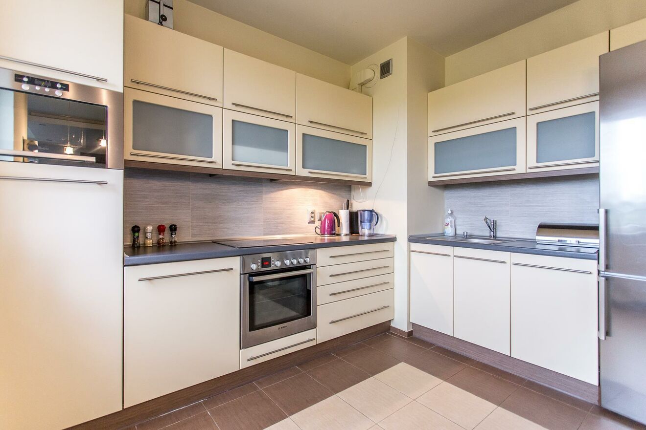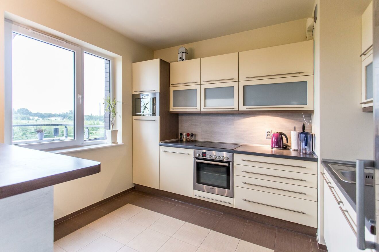 - część kuchenna połączona z barkiem komfortowo wyposażona w sprzęt AGD: piekarnik, mikrofala, płyta ceramiczna, zmywarka, lodówka.