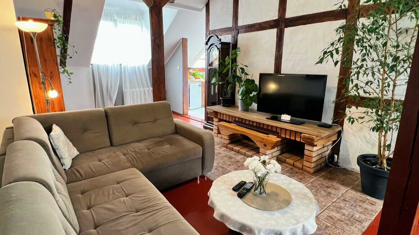 przestronny pokój o pow. ok. 33 m2, z wydzieloną częścią sypialnianą za pomocą kotary.