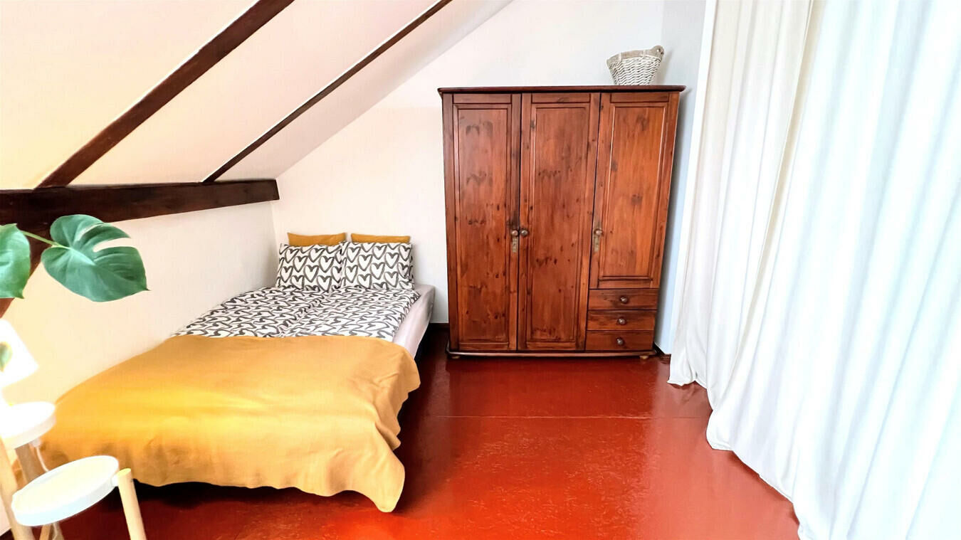 Pokój bardzo jasny, doświetlany przez dwa duże okna osadzone w lukarnach, na podłodze oryginalna podłoga tworząca stylowy nastrój poddasza.