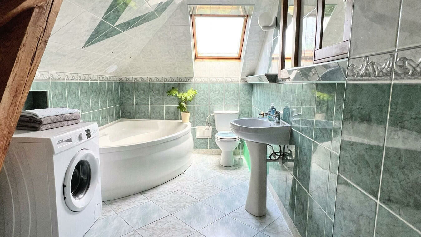 duża łazienka o powierzchni 8,40 m, wyposażona w wannę narożną, umywalkę i kompaktowe wc, z oknem, które dodaje naturalnego światła.