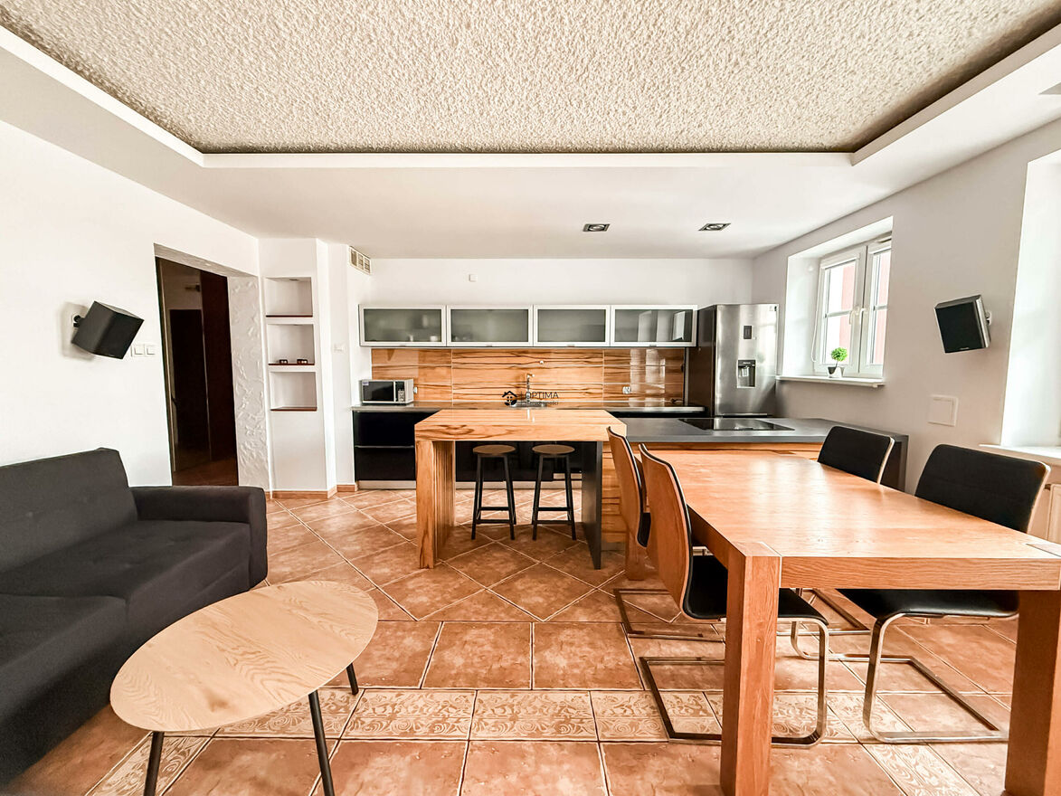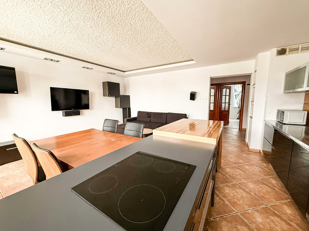 - salon z kuchnią w formie aneksu i wyjściem na balkon,