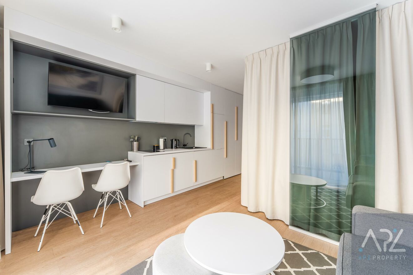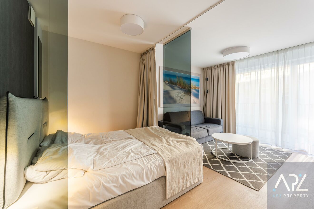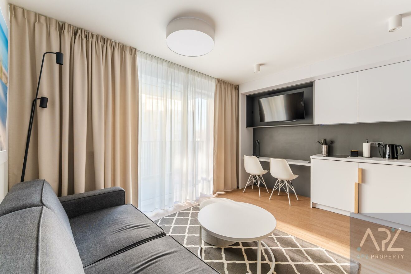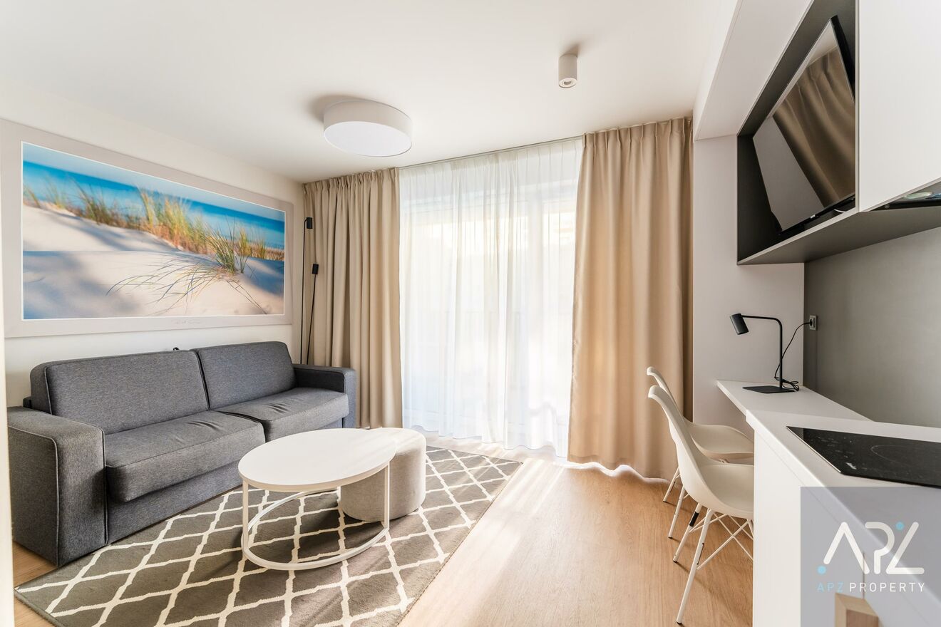 Mieszkanie jest w pełni wyposażone w najwyższej klasy meble hotelowe oraz sprzęty RTV i AGD, a ze względu na lokalizacje apartament idealnie nadaję się jako inwestycja pod wynajem krótkoterminowy lub całoroczny, ale także na potrzeby własne!