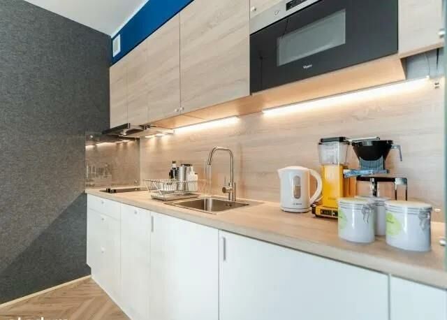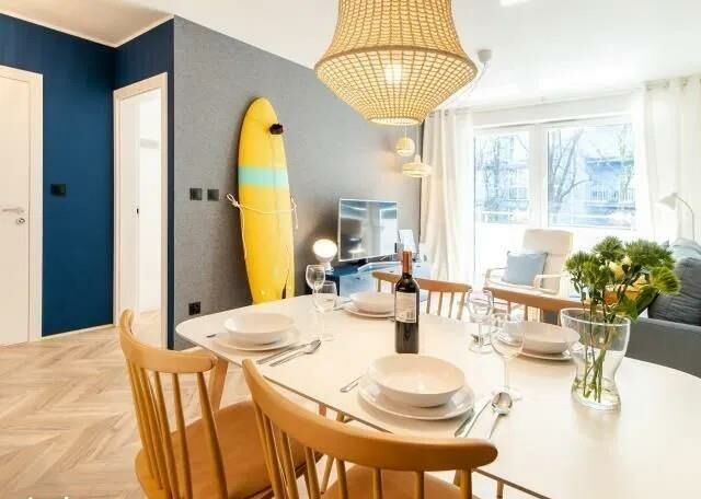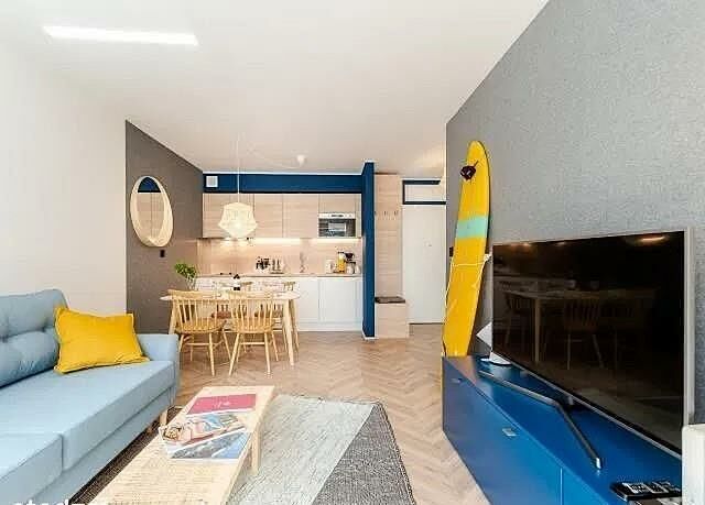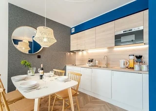 Apartament jest w pełni umeblowany ,wyposażony(sprzęt AGD, RTV, meble) oraz wykończony z wysokiej jakości materiałów.
