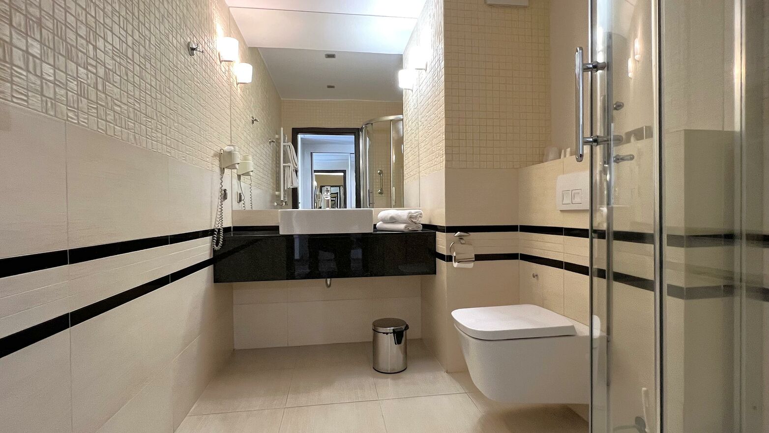 - Łazienka z wc, (na podłodze terakota, na ścianach glazura, armatura : kabina prysznicowa, miska ustępowa, umywalka wisząca).