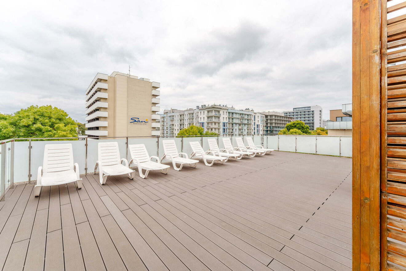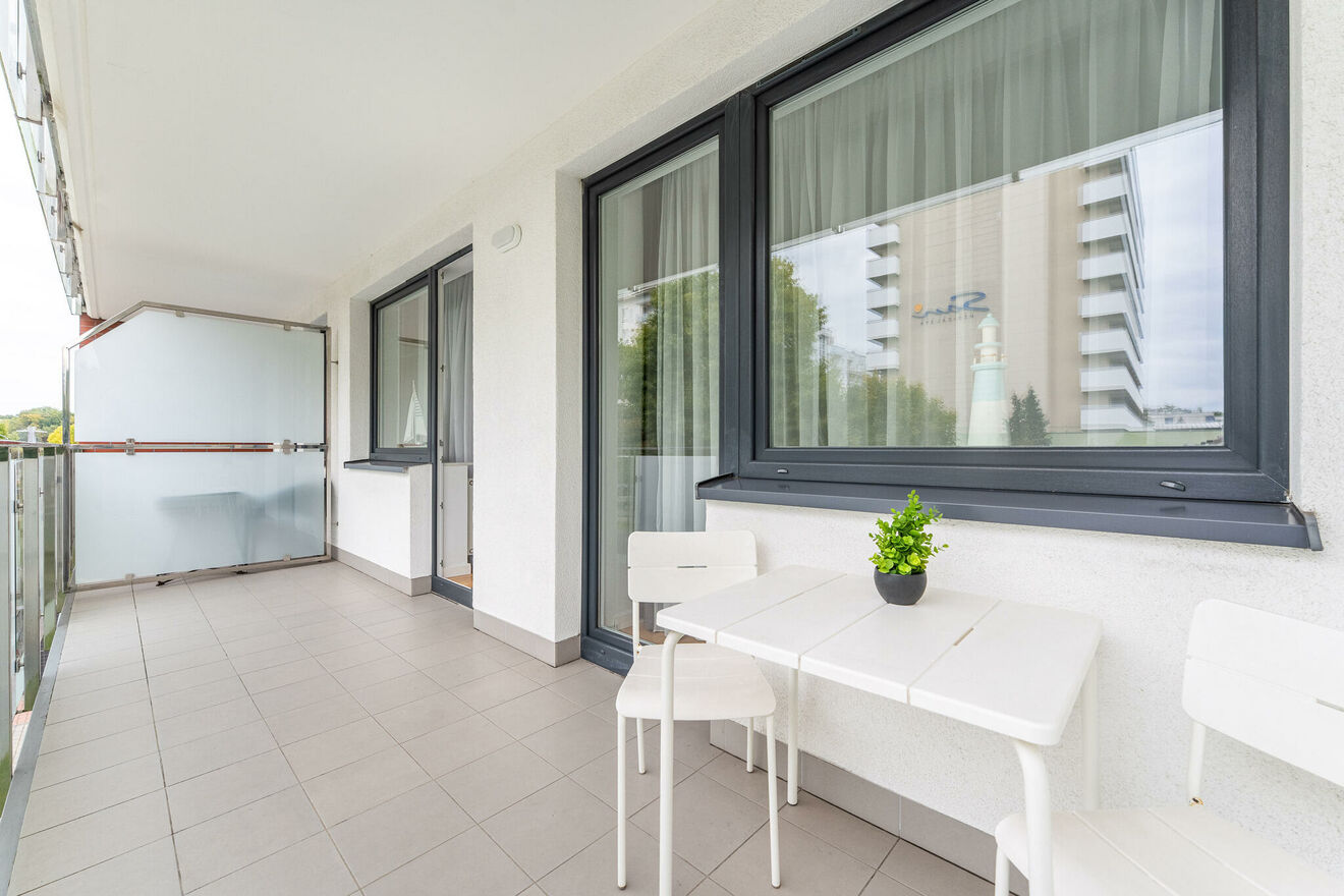 Apartament położony jest na zamkniętym i monitorowanym osiedlu "Bliżej Morza"- w samym sercu strefy uzdrowiskowej miasta. Do dyspozycji gości na terenie kompleksu jest dobrze wyposażona sala fitness, taras słoneczny na dachu z leżakami oraz rowerownia. Obiekt położony jest zaledwie o 350 metrów od piaszczystej plaży. Doskonała lokalizacja-5 minut spacerem do morza! Osoby ceniące sobie aktywny tryb życia znajdą tu liczne ścieżki pieszo rowerowe, najdłuższy deptak w Polsce wzdłuż morza oraz wiele innych atrakcji. W pobliżu znajdują się liczne restauracje, kawiarnie, baseny ze strefą Spa oraz liczne obiekty oferujące profesjonalne zabiegi leczniczo rehabilitacyjne.