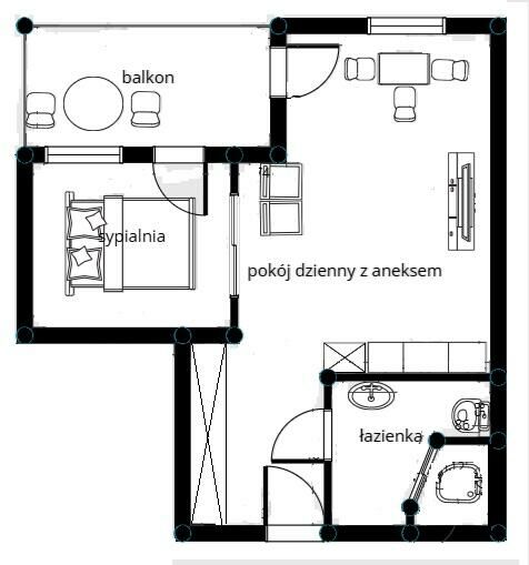 - Pokój dzienny z aneksem kuchennym z wyjściem na balkon od strony wschodniej , na podłodze znajduje się terakota, ściany - gładź gipsowa , okna + drzwi balkonowe PCV .