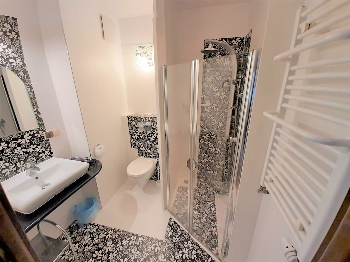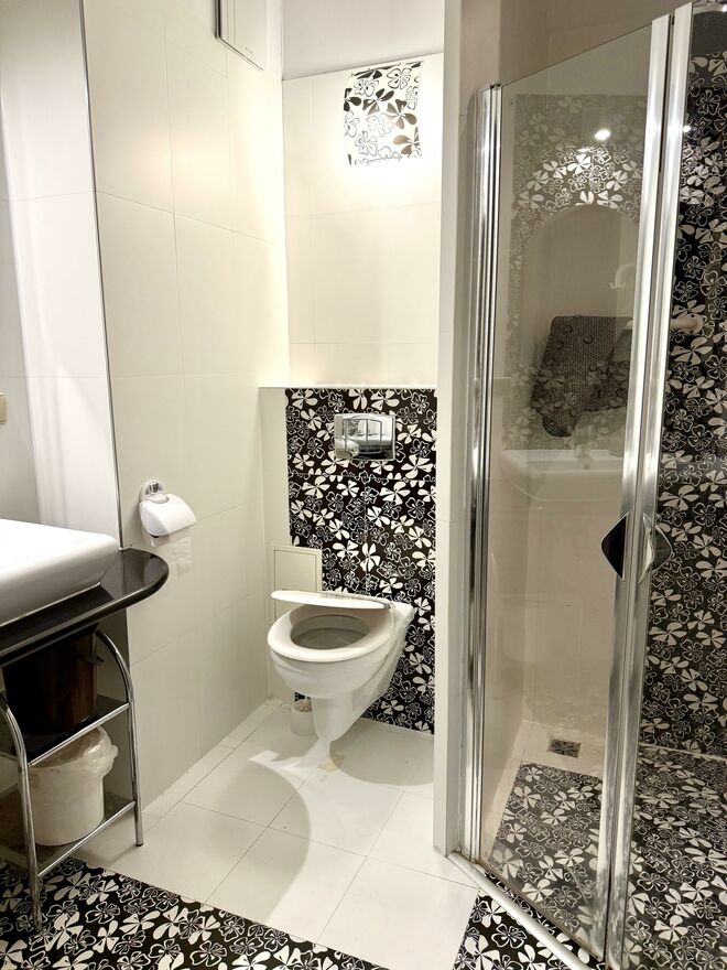 - Łazienka z wc: na podłodze terakota, glazura, armatura: kabina prysznicowa, miska ustępowa podwieszana, umywalka , pralka