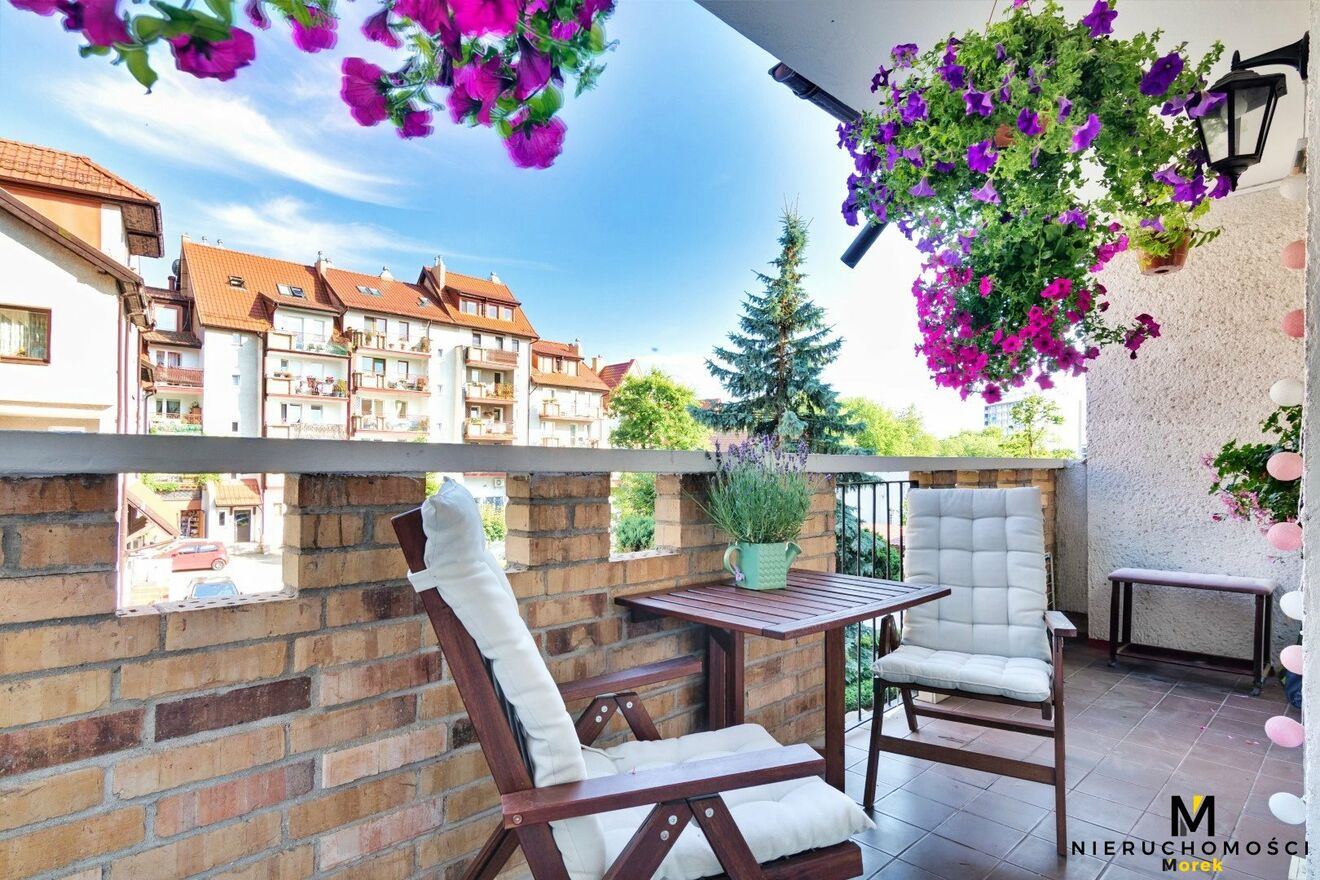 Duży, słoneczny balkon z wejściem z 2 pokoi.