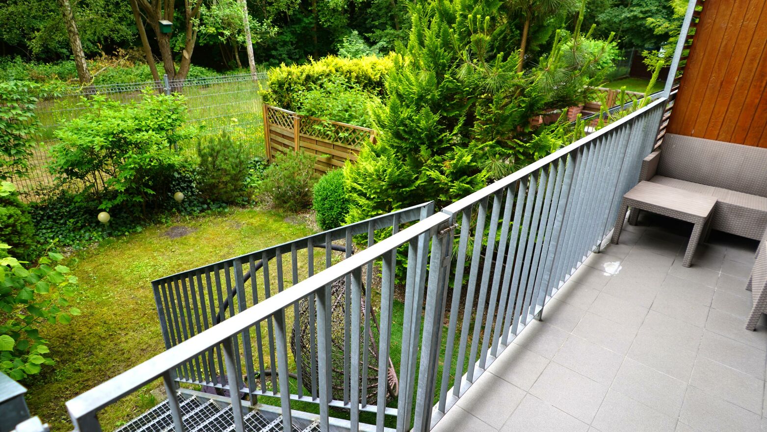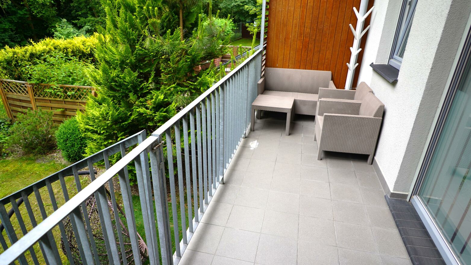 - Salonu z aneksem kuchennym z wyjściem na duży balkon oraz teren zielony ogrodzony