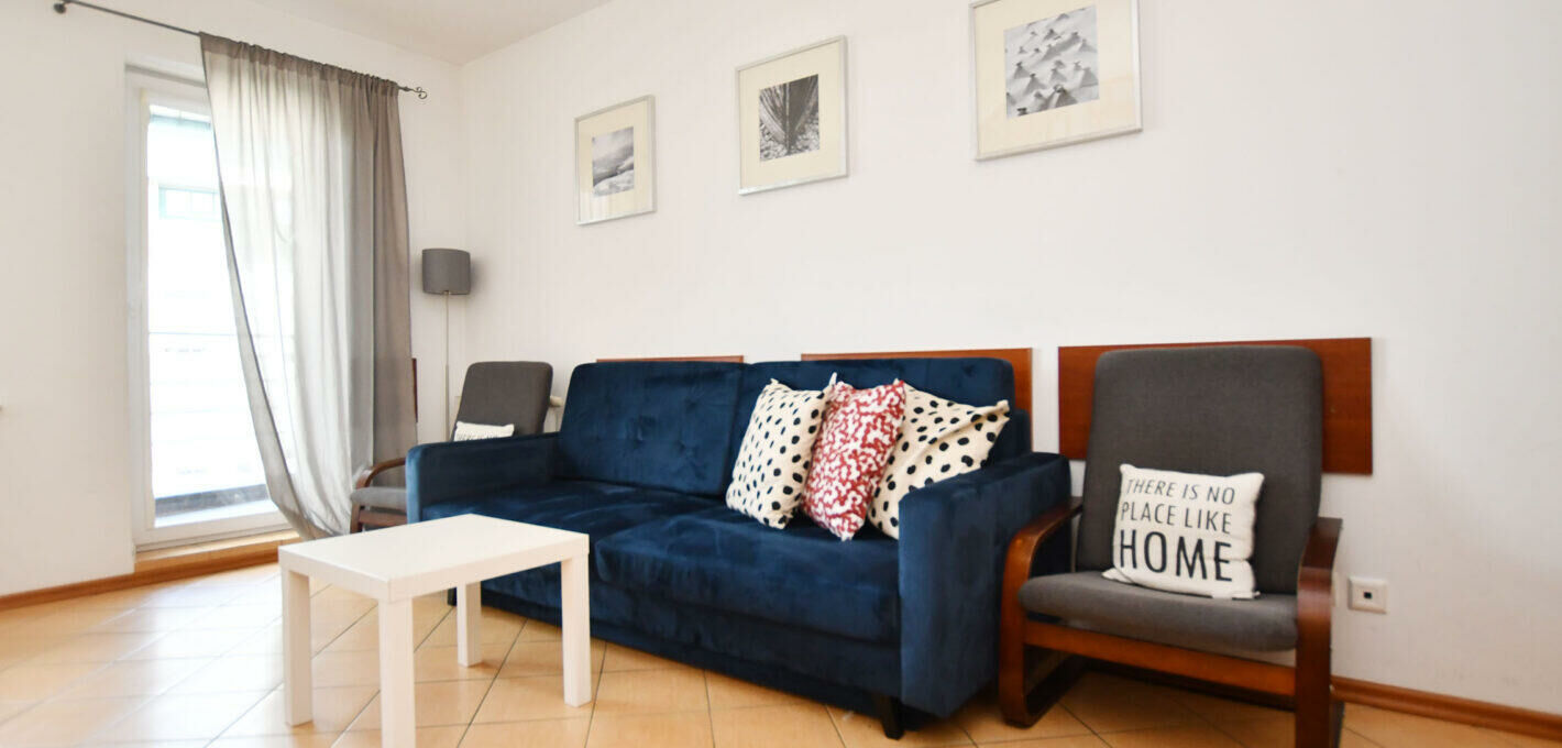 Pokój dzienny z wyjściem na słoneczny balkon idealny na poranną kawę.