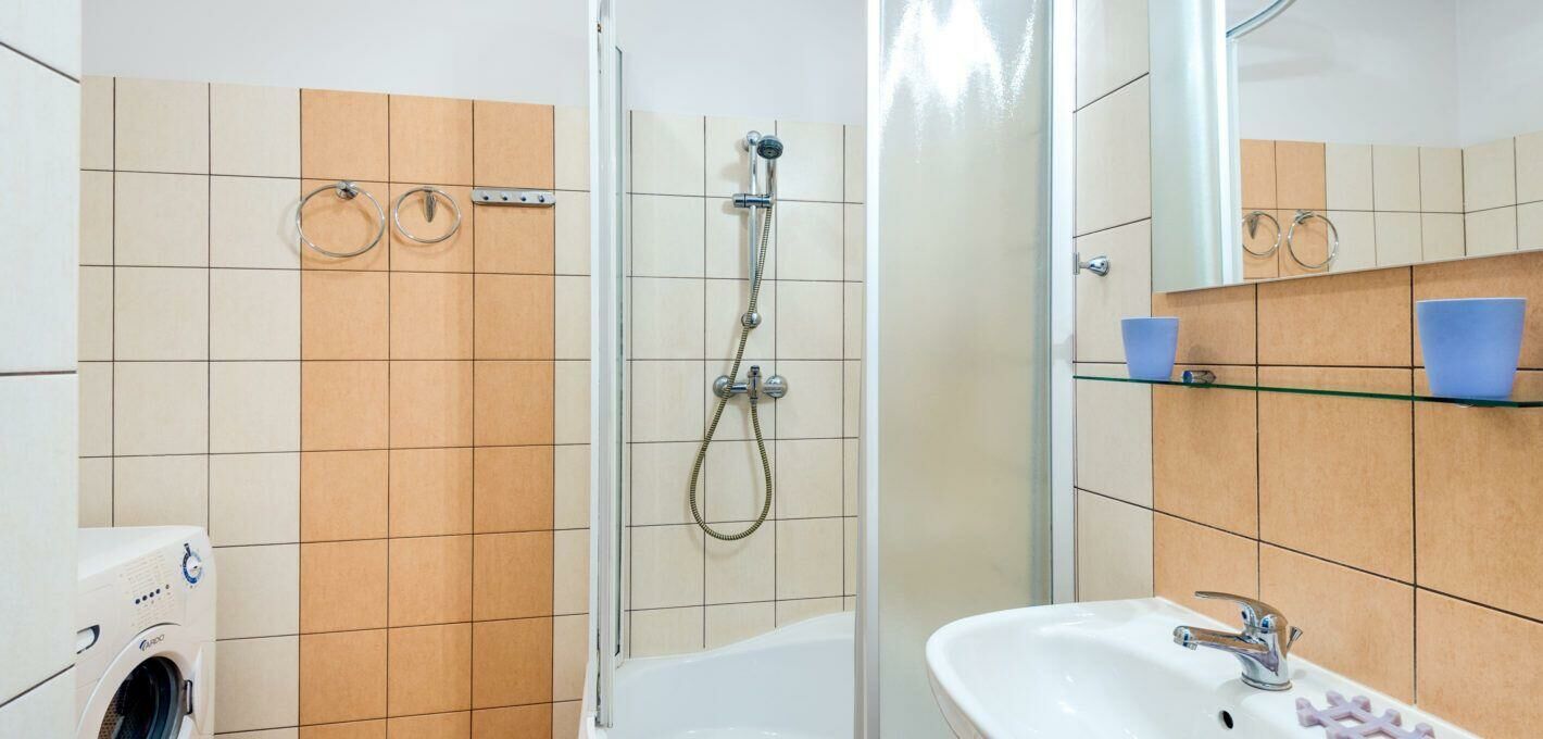 Łazienka z prysznicem i pralką.