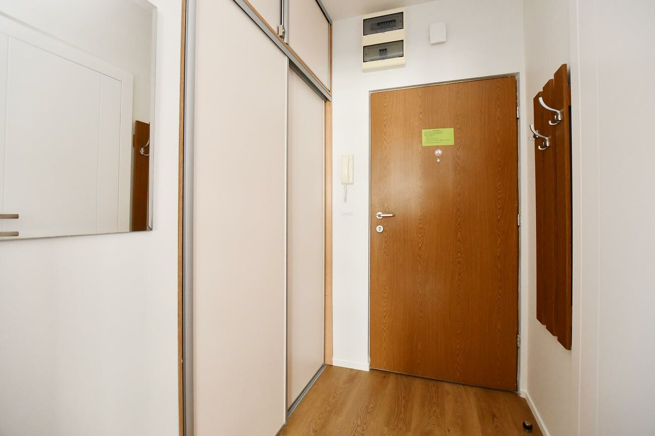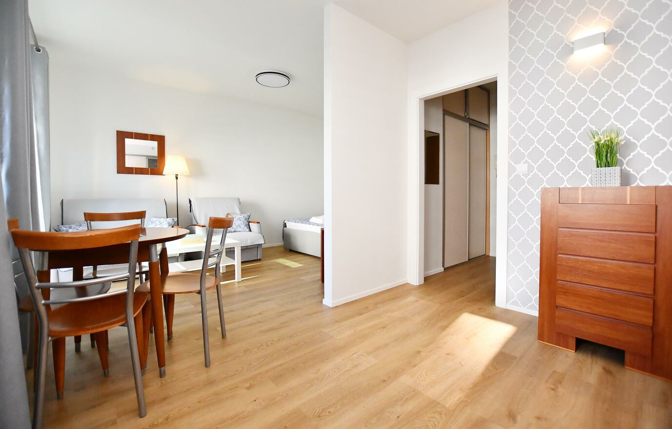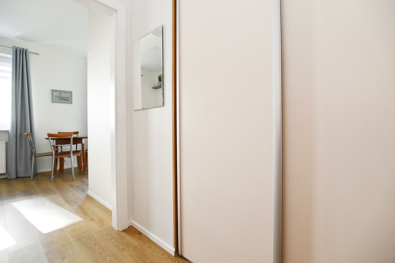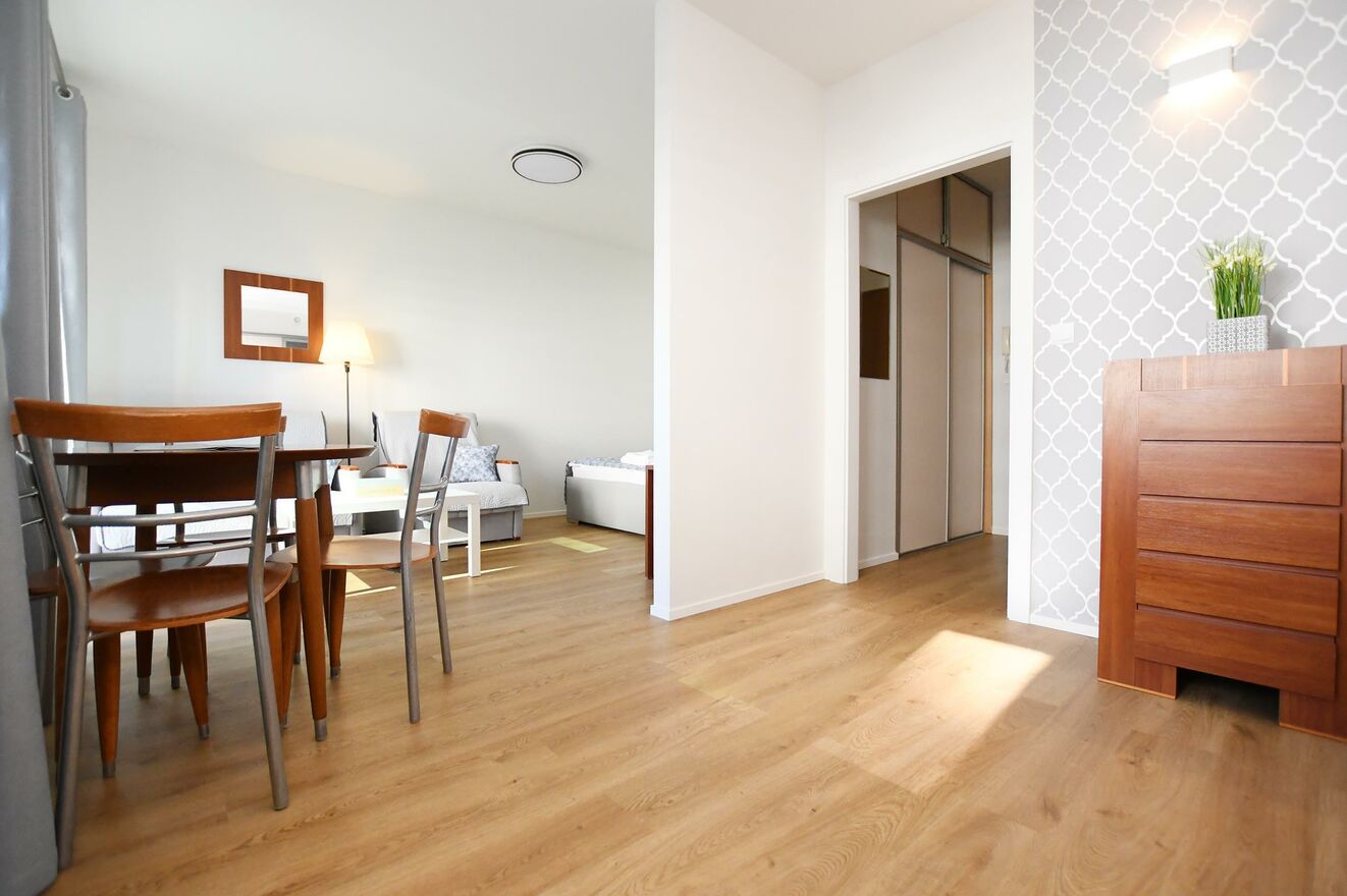 Możliwość aranżacji na 2 pokojeIstnieje możliwość łatwej przebudowy mieszkania poprzez postawienie jednej ścianki działowej i wydzielenie sypialni z oknem (np. z drzwiami przesuwnymi), co pozwala uzyskać funkcjonalny układ dwupokojowy.