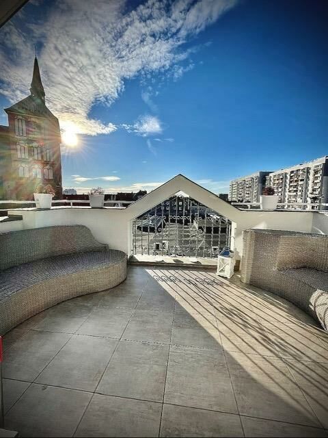 Wyjście na duży 13m2 taras z salonu z widokiem na katedrę (południowy-zachód) z drugiej strony widok na park przy ulicy Dubois.