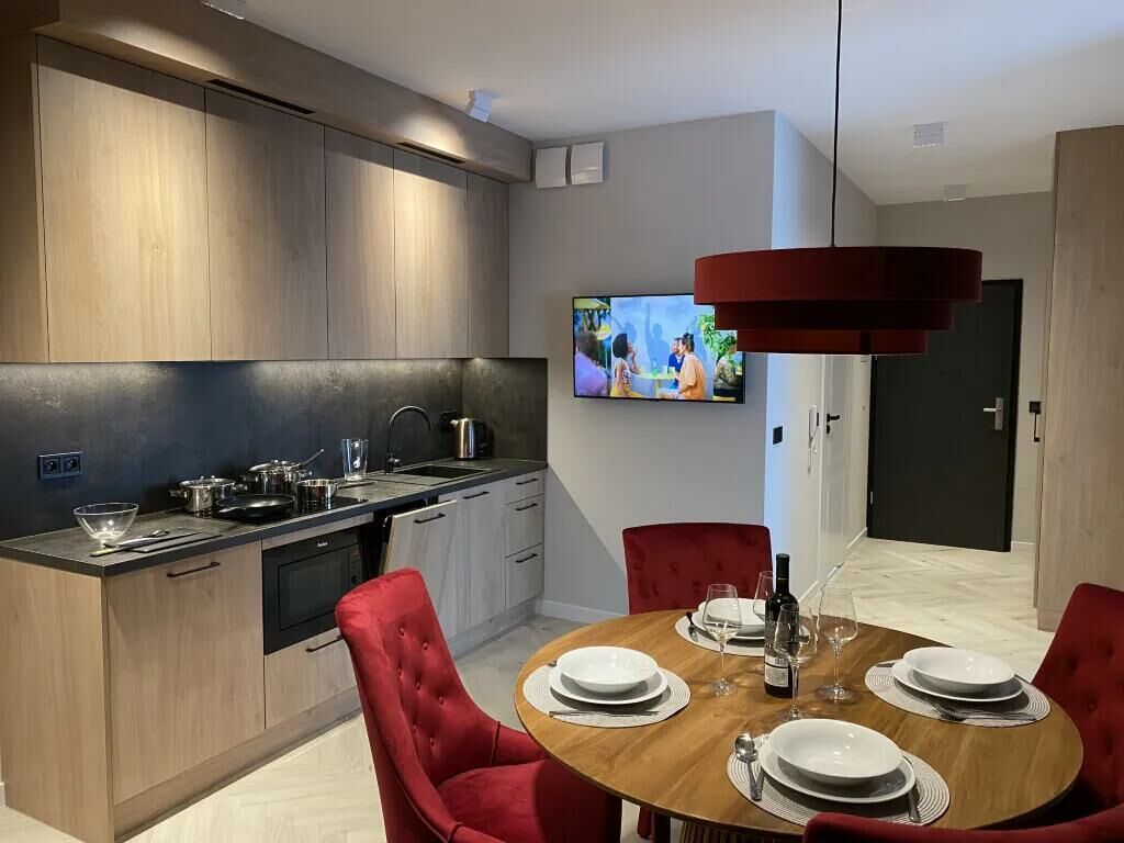 Stół z krzesłami, czajnik, kuchenka mikrofalowa, płyta indukcyjna, lodówka z zamrażarką, zmywarka, pralka, zestaw garnków i patelni, sztućce, szklanki, kieliszki.