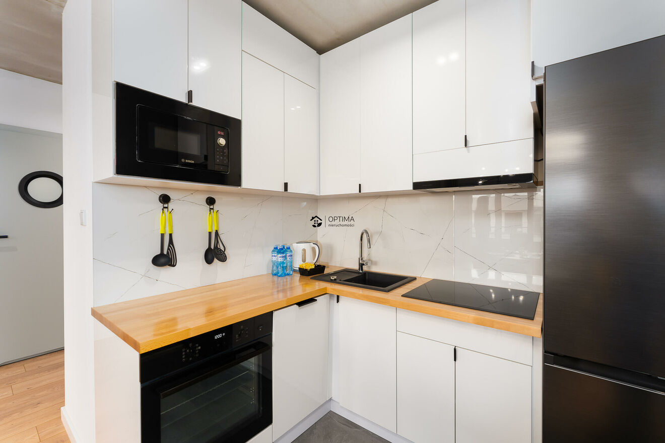 Kuchnia w formie aneksu jest funkcjonalnie zaprojektowana, znajduje się w niej: kuchenka mikrofalowa, piekarnik, zmywarka, płyta grzewcza, lodówka. Duży balkon zapewnia widok na kanał drzewny oraz na Bazylikę Konkatedralną.