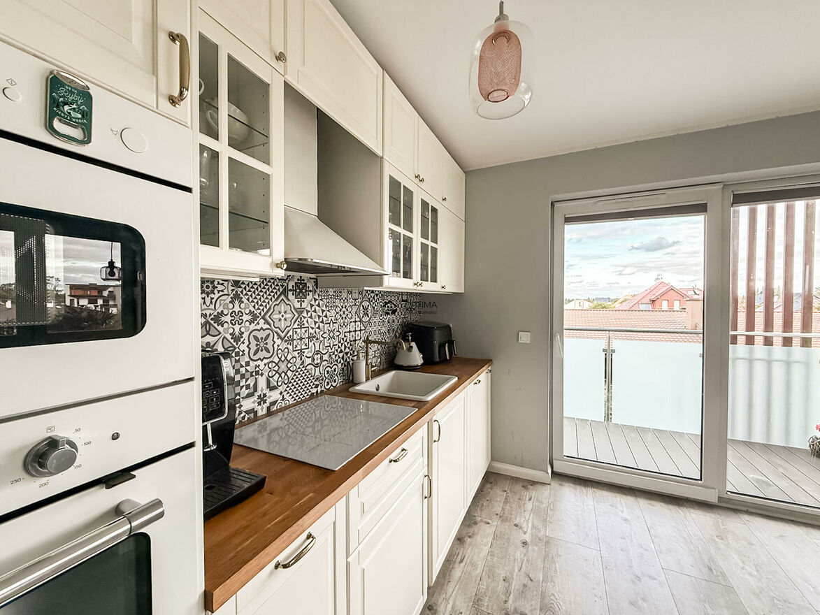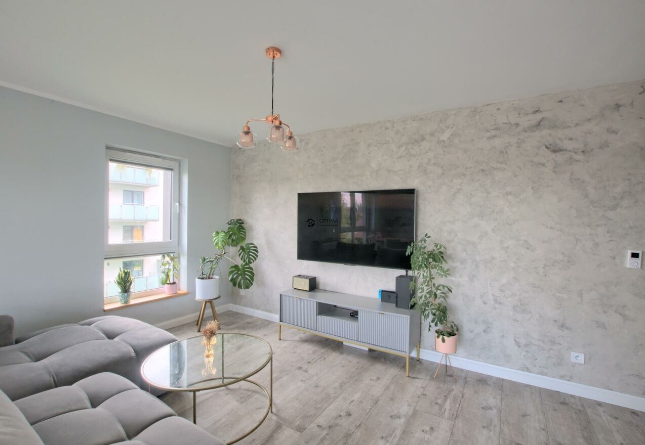 Mieszkanie charakteryzuje się dużym balkonem, a dzięki dużym oknom wnętrze jest dobrze doświetlone, co dodaje przestronności i przytulności.