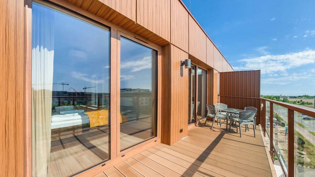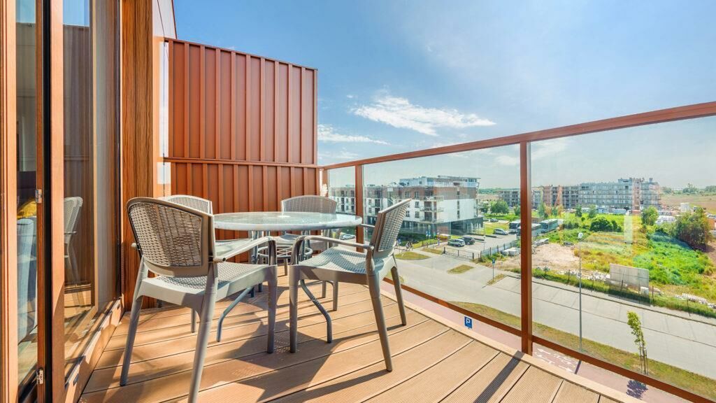 Balkon w tym mieszkaniu ma podwyższone przegrody oddzielające od sąsiadów co daje dodatkowo poczucie spokoju i intymności.