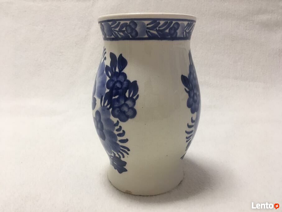 Dzień dobry Państwu.Oferuję do sprzedaży wazon z uchem / dzbanek z czasów PRL-u. Sygnowany. Rzadko spotykany model. Produkcja polska Zakład Fajansu Koło. Kolory żywe, nie wyblakłe. Odcienie niebieski / granat / biel. Kolorystyka sprawia, że będzie pasować do otocznia o podobnych barwach i wystroju wnętrza. Mały minusik to: ukruszenia od spodu (zdjęcie). Nie powodujące chwiania się dzbanka. Mało widoczne.