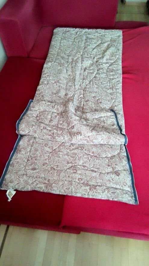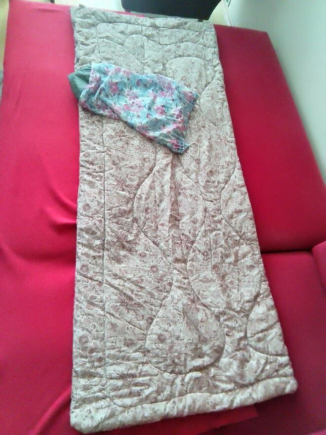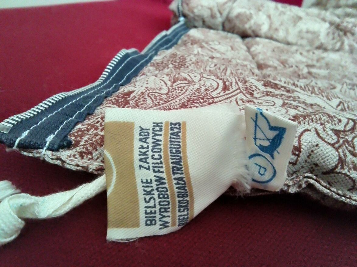 Odbiór osobisty. Wymiary +- 180x80Widoczne na zdjęciu charakterystyczne pikowanie (przeszycia) służyło zapobieganiu przemieszczaniu się ociepliny. W produktach Bielskich Zakładów Wyrobów Filcowych najczęściej stosowano grube warstwy waty poliestrowej lub mieszanek bawełniano-wiskozowych (Watolina/Poliester) co czyni te śpiwory dość ciężkimi, ale bardzo trwałymi, co sprawia, że są "cieplejsze" niż nowoczesne, najtańsze śpiwory marketowe, ale jednocześnie cięższe i trudniejsze do kompresji. Zazwyczaj wypełnienie o gramaturze od 300 do 500 g/m².