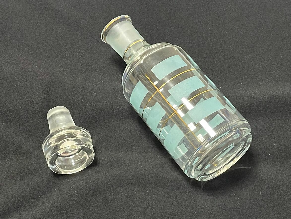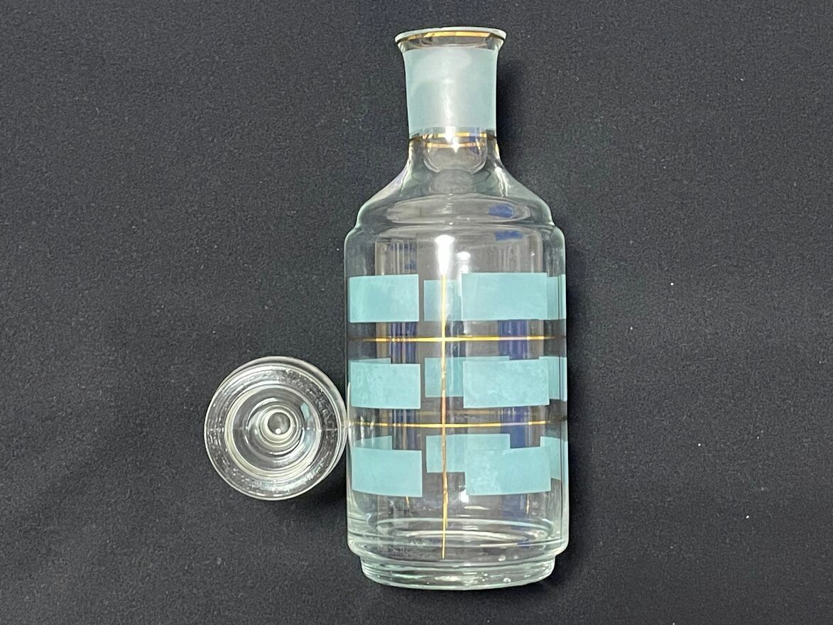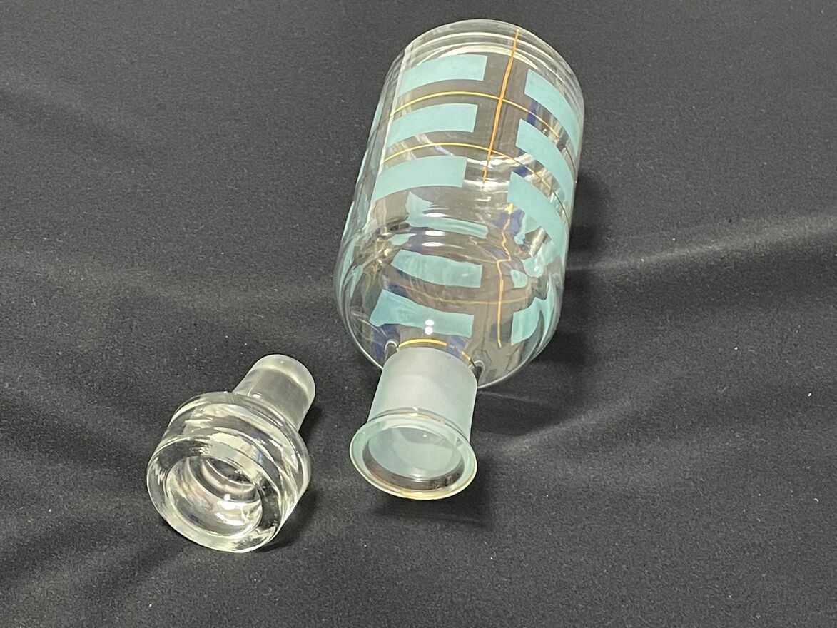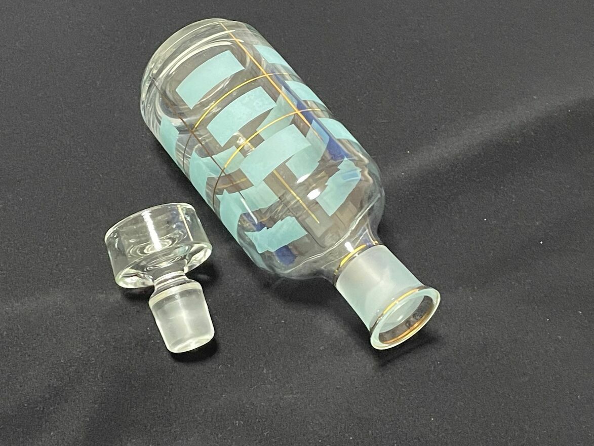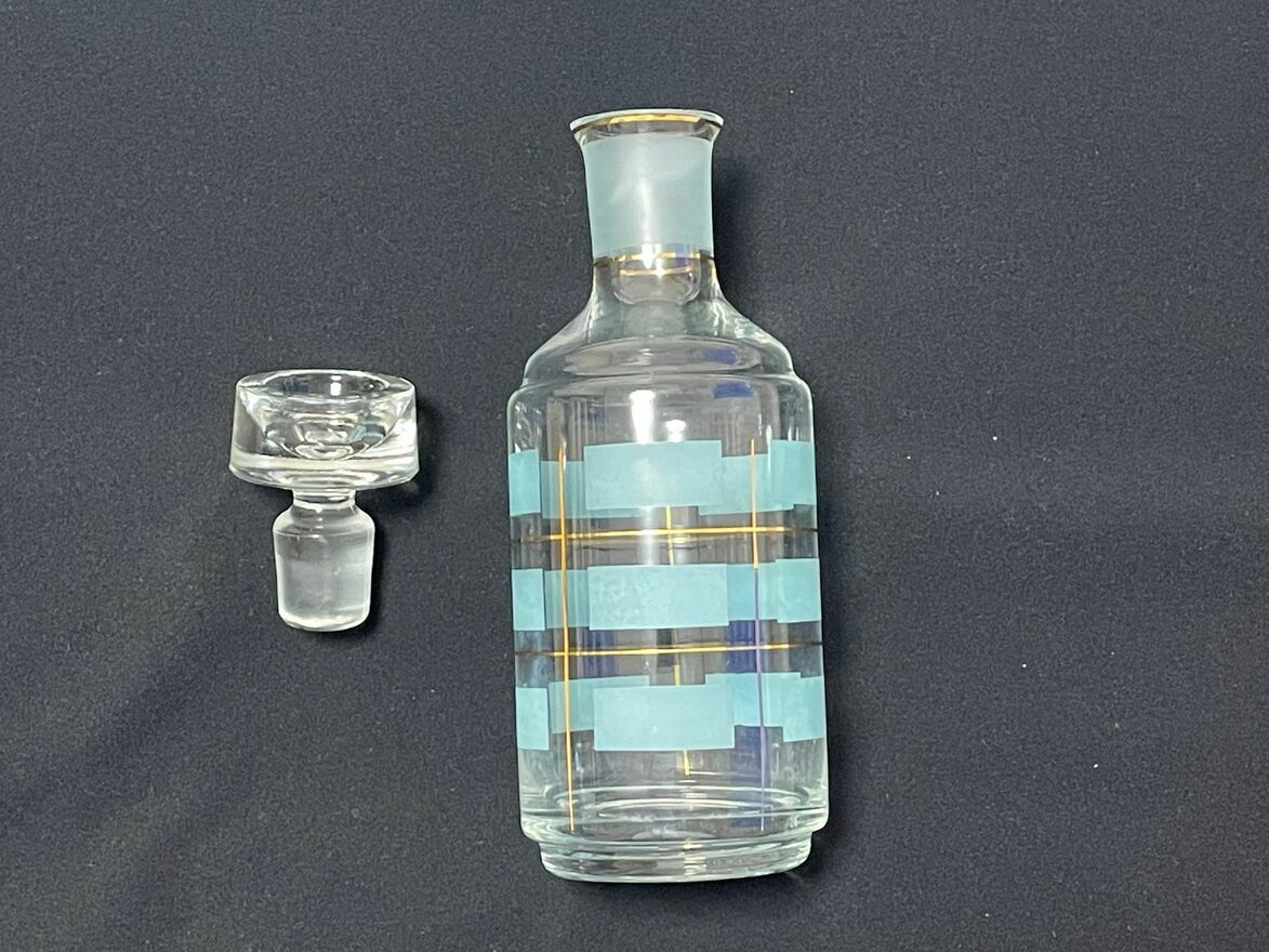 Dzień dobry Państwu.Oferuję do sprzedaży starą butelkę / karafkę do trunków o pojemności 500 ml – 600 ml. Wysokość z korkiem 23,5 cm. Polska produkcja Huty Szkła Hortensja. Kolor pistacjowy / złocony. Pochodzi z przełomu lat 60 / 70-tych ubiegłego wieku. Zdobienia wyraźne, nie wytarte a nie wszyscy o tym piszą. Stąd zamieszczam fotografie z różnych stron. Stabilna. To, co wyróżnia moją ofertę to brak kamienia / osadu na dnie butelki trudnego do wyczyszczenia. Mały minusik, to mikroodpryski na górnej krawędzi (3 i 4 zdjęcie), bez tendecji do powiększania. Stąd atrakcyjna cena.