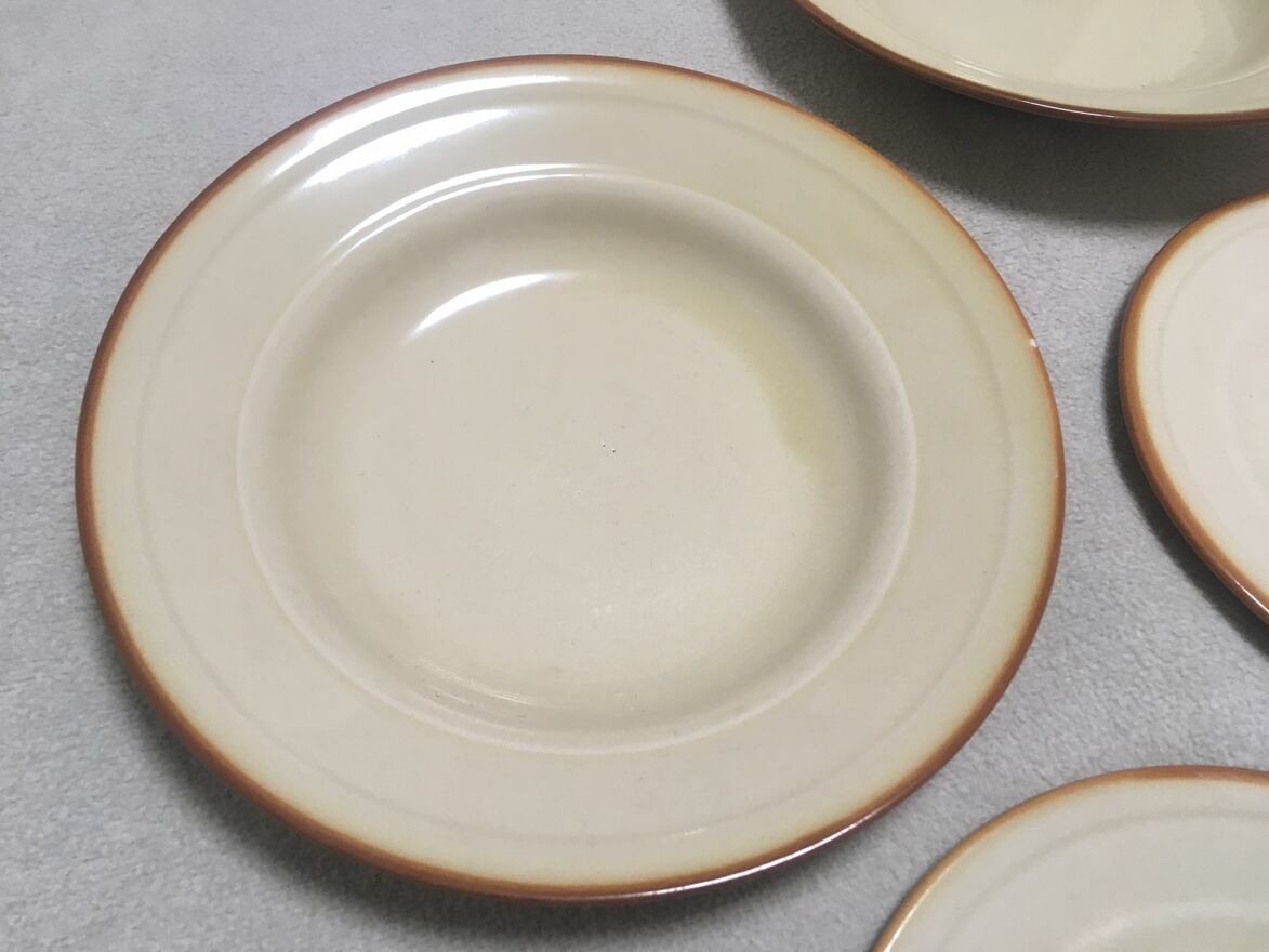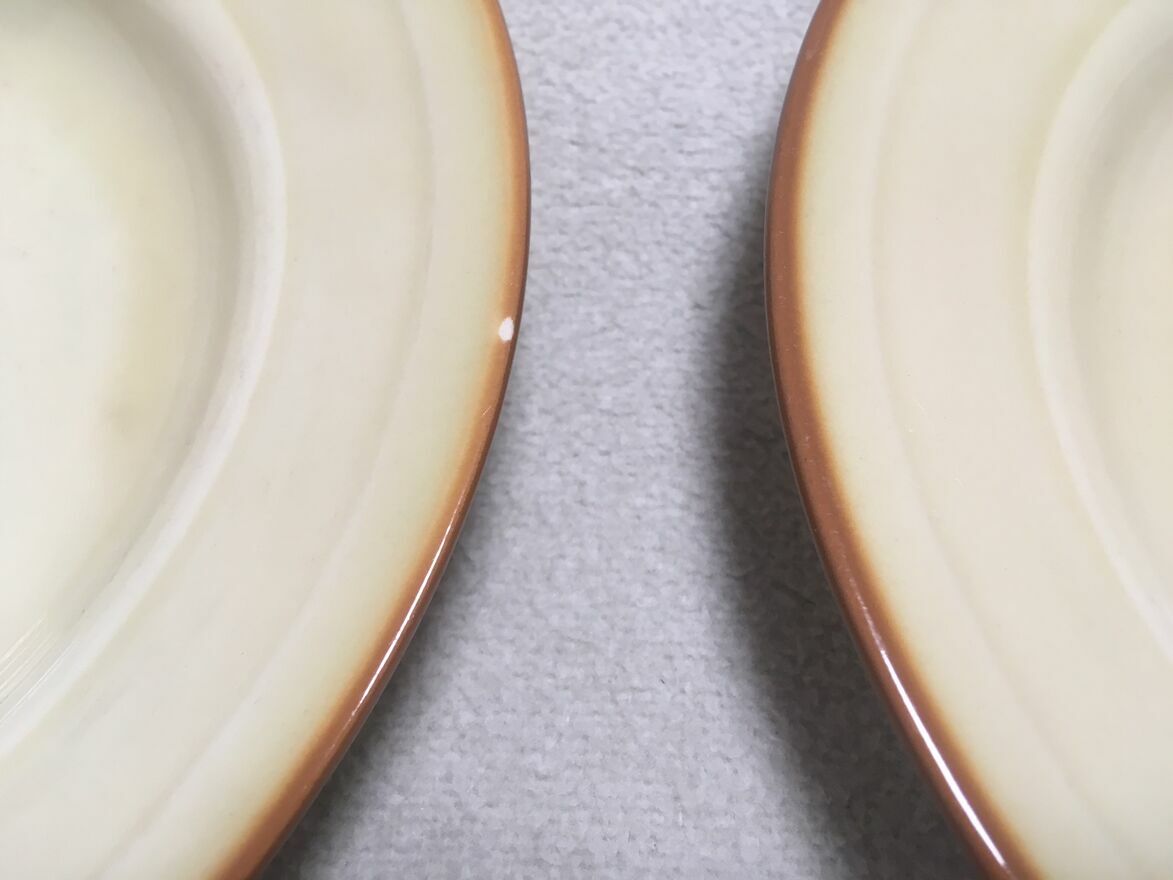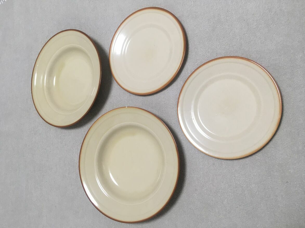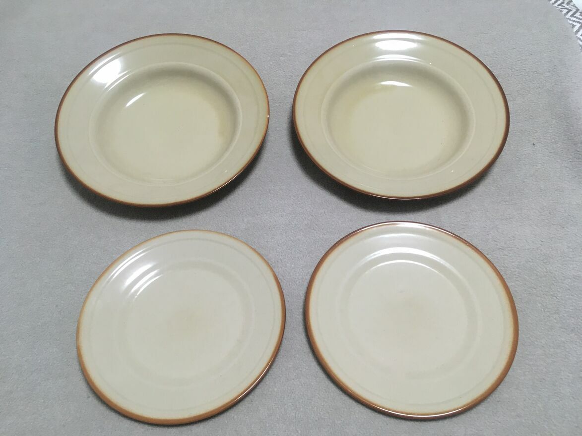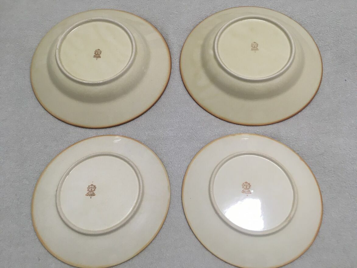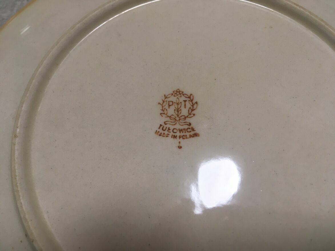 Dzień dobry Państwu.Polecam do nabycia stare dwa talerze głębokie i dwa deserowe talerze z okresu PRL-u polskiego producenta TUŁOWICE. Stan dobry. Logo firmowe wyraźne. Spód nie wykruszony. Bez pęknięć. Ładne gustowne kolory jasnego brązu przechodzące łagodnie do zaakcentowanej ciemniejszej krawędzi. Stanowić będzie doskonałe uzupełnienie zbioru kolekcjonera. Mały minusik (4 zdjęcie), to mikro odprysk na dużym talerzu bez tendencji do powiększania.