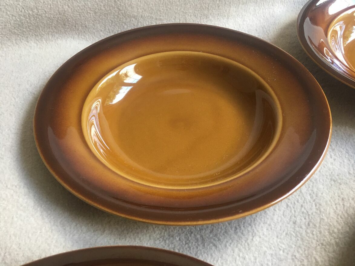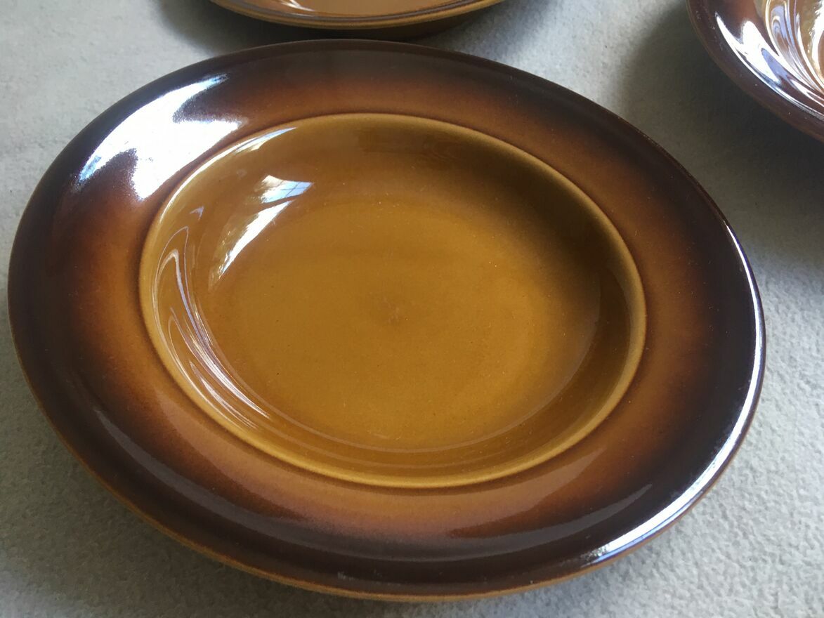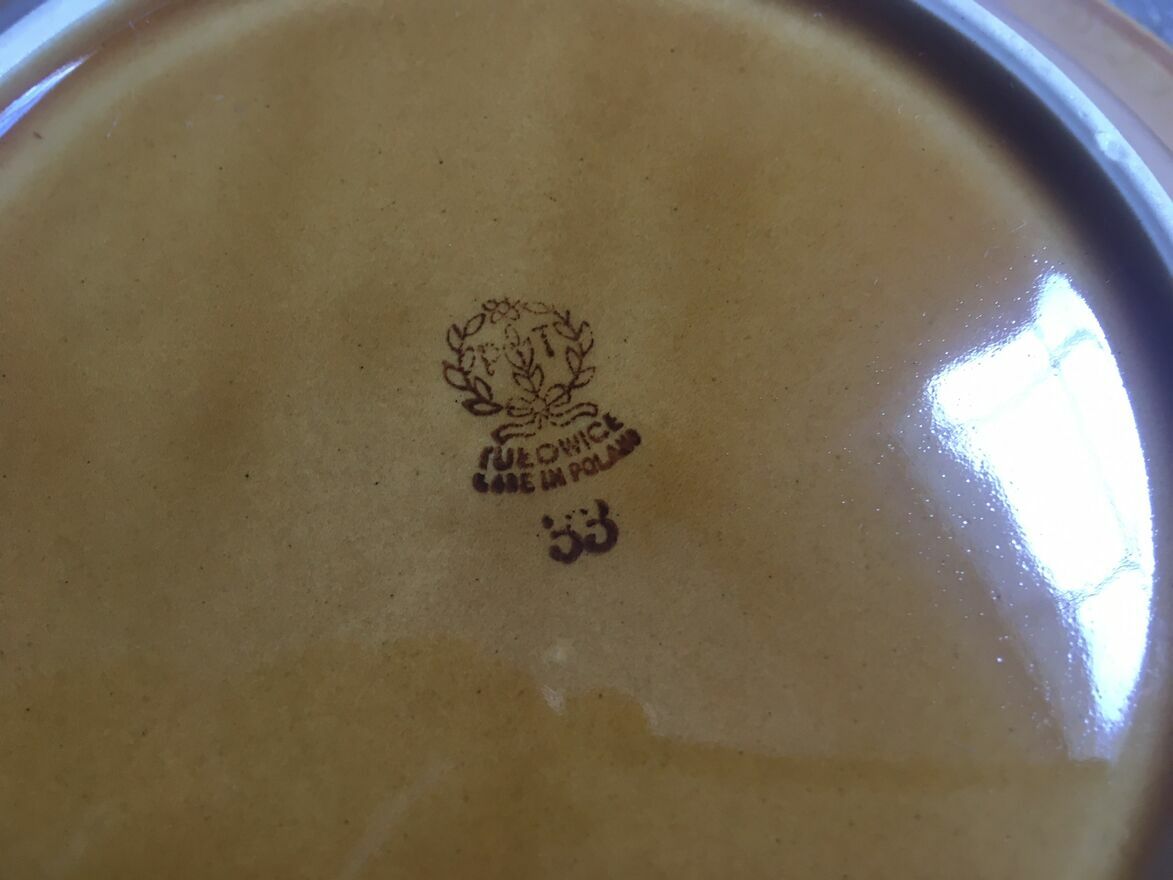 Dzień dobry Państwu.Polecam do nabycia stare talerze głębokie z okresu PRL-u polskiego producenta TUŁOWICE. Stan bardzo dobry. Logo firmowe wyraźne. Spód nie wykruszony. Bez pęknięć. Ładne gustowne kolory brązu przechodzące łagodnie z odcienia jasnego do ciemniejszego. Stanowić będzie doskonałe uzupełnienie zbioru kolekcjonera. W takim stanie zachowania trudno znaleźć ładniejsze, a najczęściej zdarzają się wyraźnie porysowane. Zachęcam do nabycia. Wysyłka możliwa. W razie pytań, proszę dzwonić lub pisać.