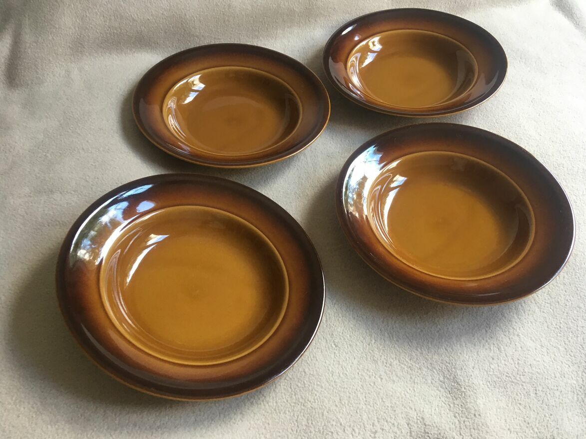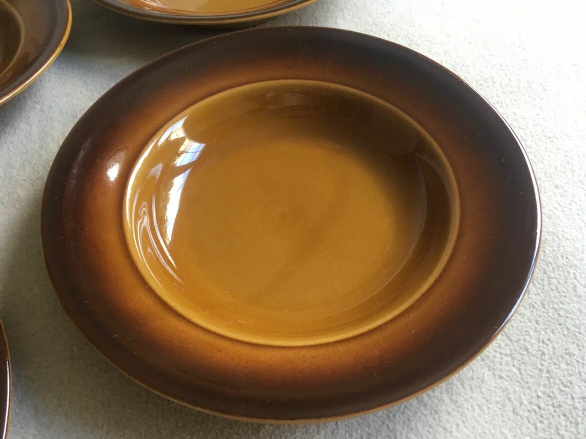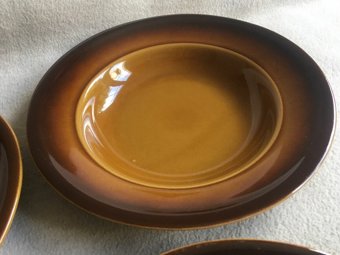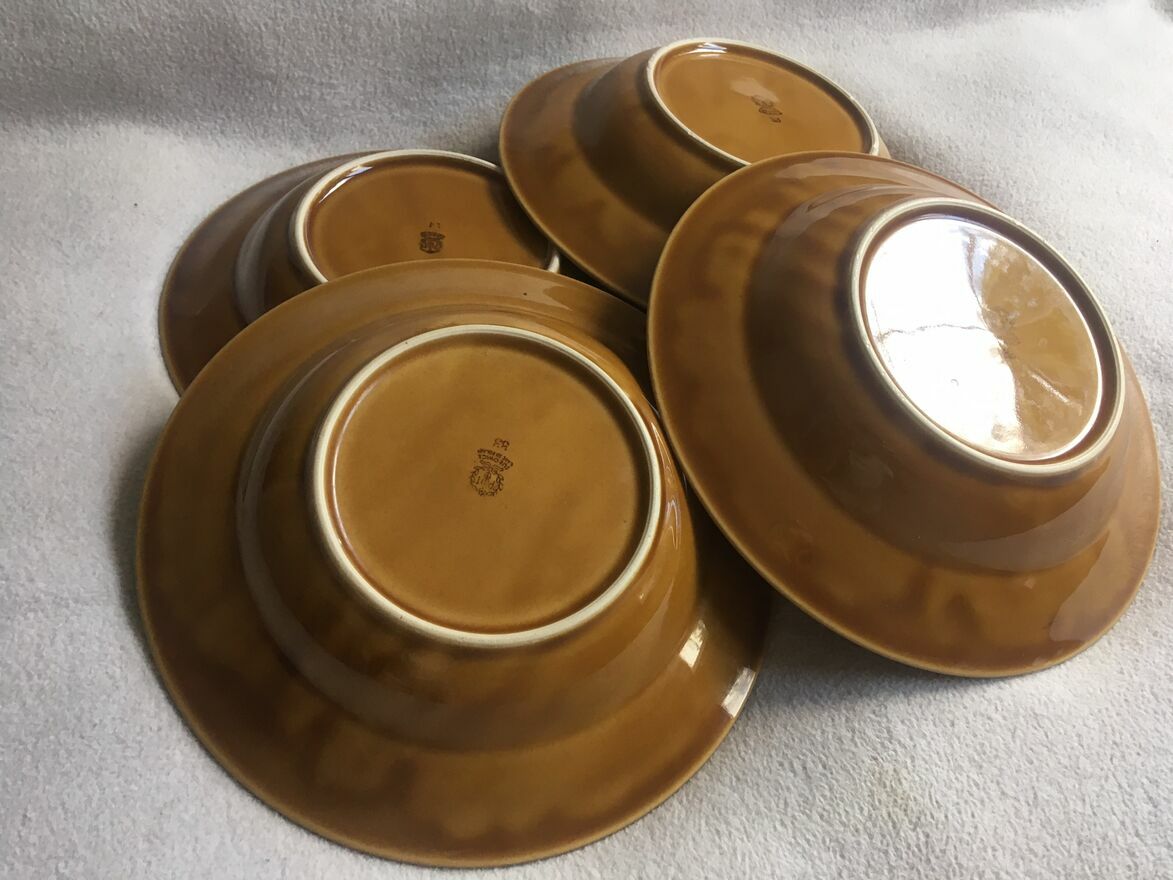 Dzień dobry Państwu.Polecam do nabycia stare talerze głębokie z okresu PRL-u polskiego producenta TUŁOWICE. Stan bardzo dobry. Logo firmowe wyraźne. Spód nie wykruszony. Bez pęknięć. Ładne gustowne kolory brązu przechodzące łagodnie z odcienia jasnego do ciemniejszego. Stanowić będzie doskonałe uzupełnienie zbioru kolekcjonera. W takim stanie zachowania trudno znaleźć ładniejsze, a najczęściej zdarzają się wyraźnie porysowane. Zachęcam do nabycia. Wysyłka możliwa. W razie pytań, proszę dzwonić lub pisać.