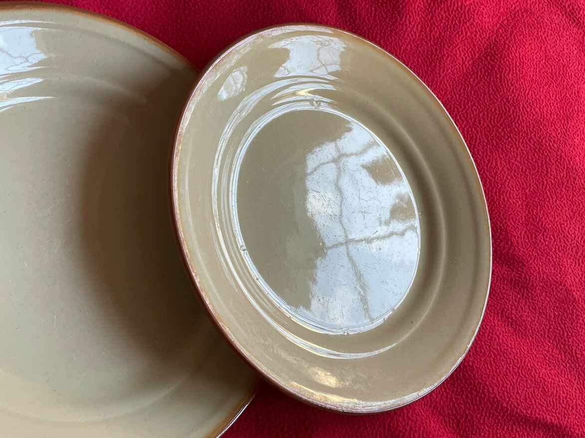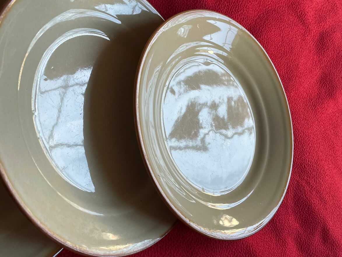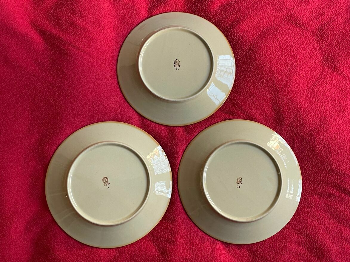 Dzień dobry Państwu.Polecam do nabycia 3 stare talerze płaskie z okresu PRL-u polskiego producenta TUŁOWICE. Porcelit. Stan dobry. Używane, mikro ryski użytkowe, dokładne zdjęcia. Logo firmowe wyraźne. Spód nie wykruszony. Bez pęknięć. Ładne gustowne kolory brązu / beżu łączące się z brązową linią krawędzi. Stanowić będzie doskonałe uzupełnienie zbioru, np. stłuczonych własnych, na zapas.